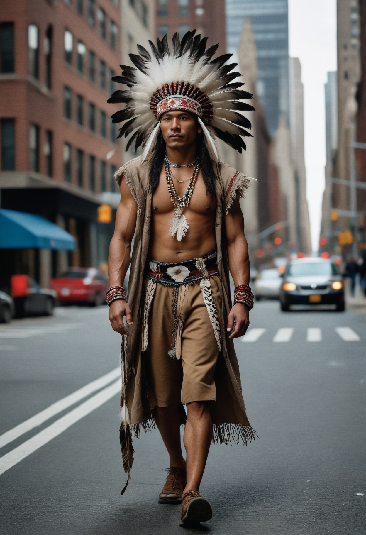 - Leica Hasselblad portrait, hyperdetailed Photography, a Native American man walks proudly confidently in traditional clothing with an Indian feather hat on his head a wolf accompanies him in the streets of New York in the middle of the buildings in the middle of the road. Large view