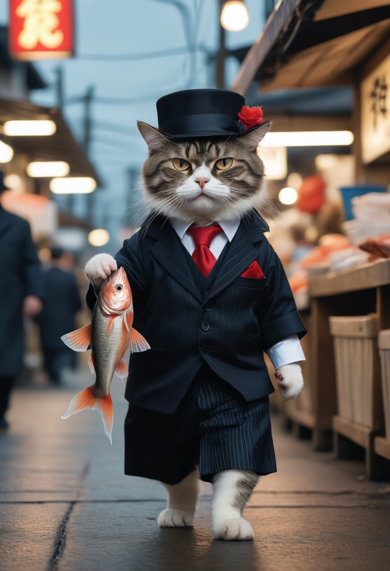 - A hyperdetailed photograph of a Cat dressed as a mafia boss holding a fish walking down a Japanese fish market with an angry face, 8k resolution, best quality, beautiful photograph, dynamic lighting,