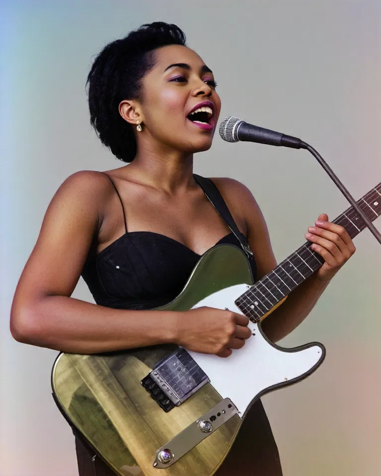 - HST style photo of a young woman playing a Telecaster electric guitar and singing the blues