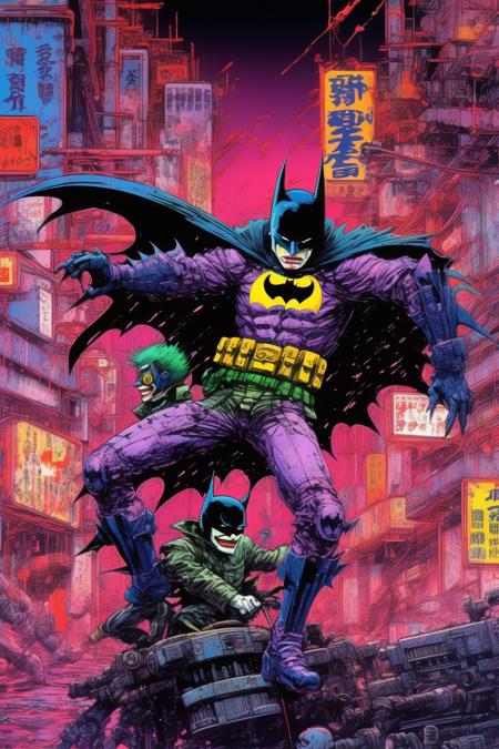 - text: "Liam Wong Style - An action-packed scene of Batman fighting The Joker in a cyberpunk cityscape, with a gritty, neon-lit aesthetic. Highly detailed with sharp lines and bold colors, reminiscent of Japanese anime. Art by Masamune Shirow and Katsuhiro Otomo."