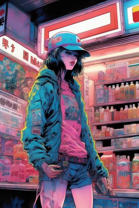 > Liam Wong Style - Vintage 90's anime style environmental wise shot. cluttered 7/11 interior; a woman wearing streetwear; by hajime sorayama, greg tocchini, virgil finlay, sci-fi, colors, neon lights. line art. environmental art.