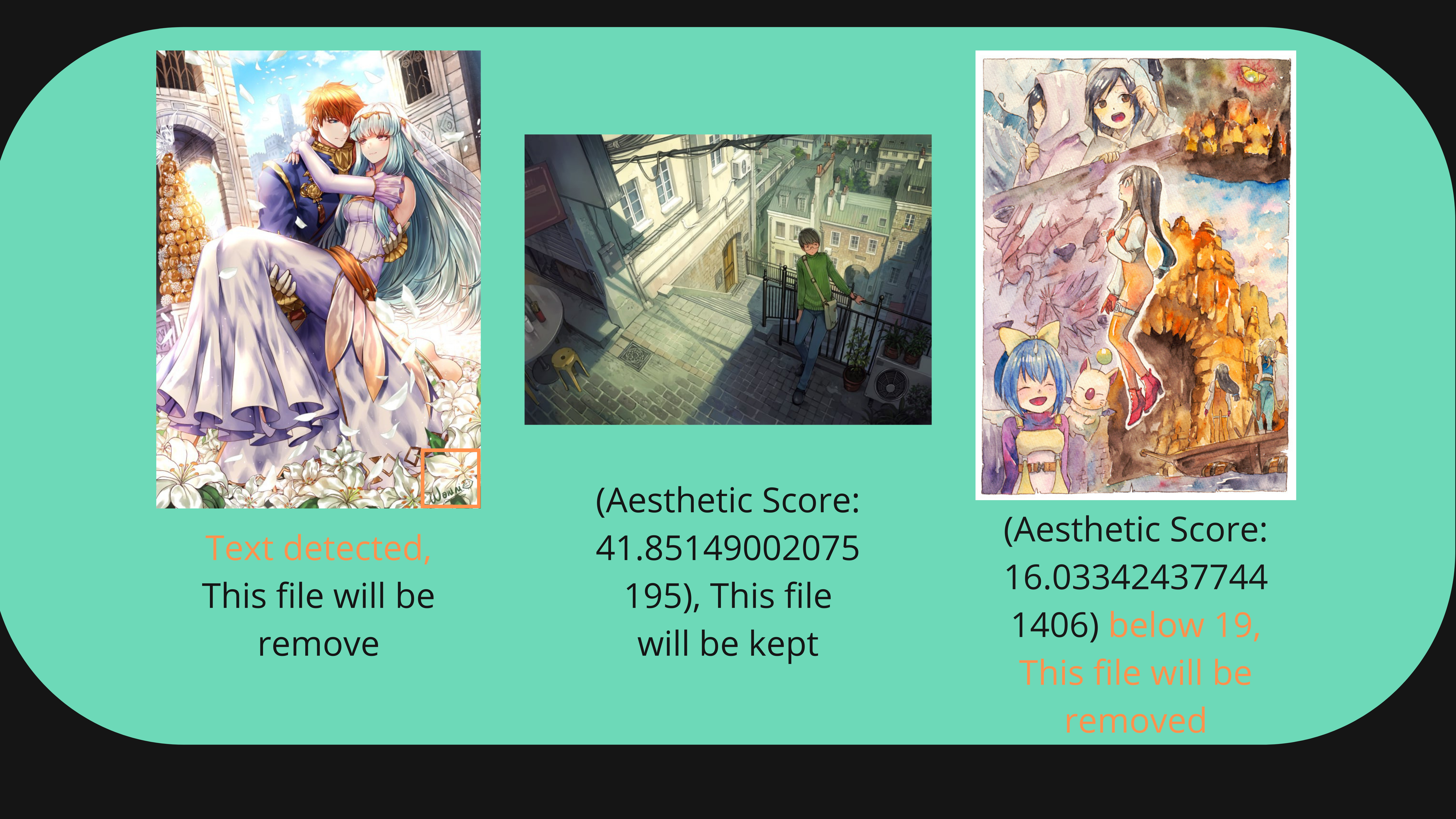 Our dataset is scored using Pretrained CLIP+MLP Aesthetic Scoring model by https://github.com/christophschuhmann/improved-aesthetic-predictor, and We made adjusment into our script to detecting any text or watermark by utilizing OCR by pytesseract