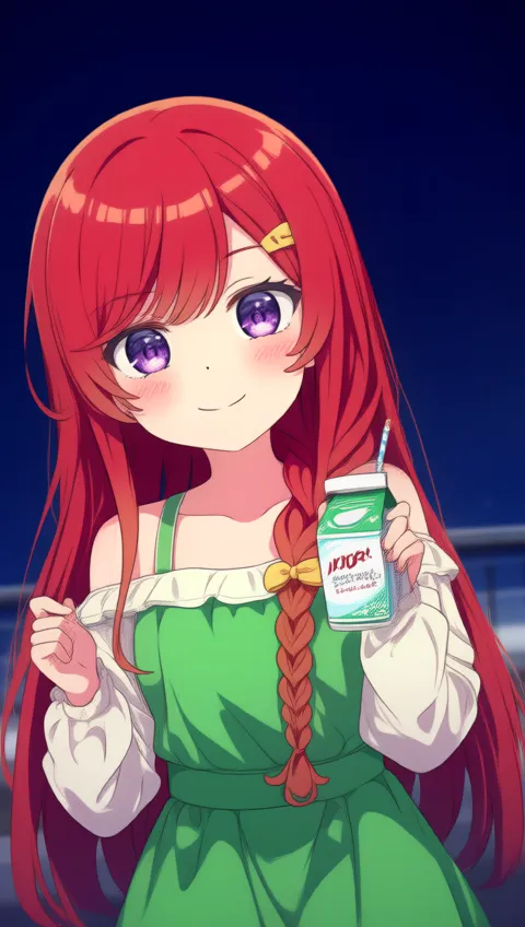 - anime girl 1girl, alcohol carton, blush, braid, bridge, crosswalk, dress, green dress, holding carton, long hair, long sleeves, multiple girls, night, open mouth, outdoors, pedestrian bridge, purple eyes, red hair, single braid, solo focus, spaghetti strap