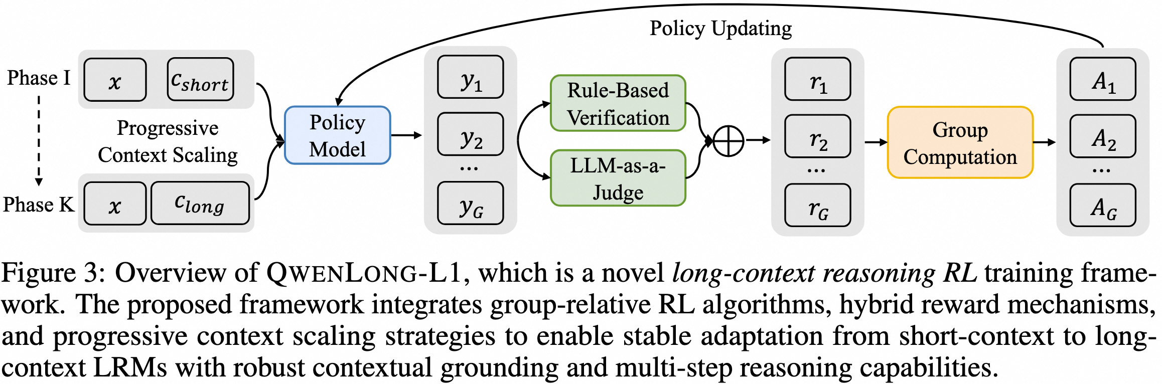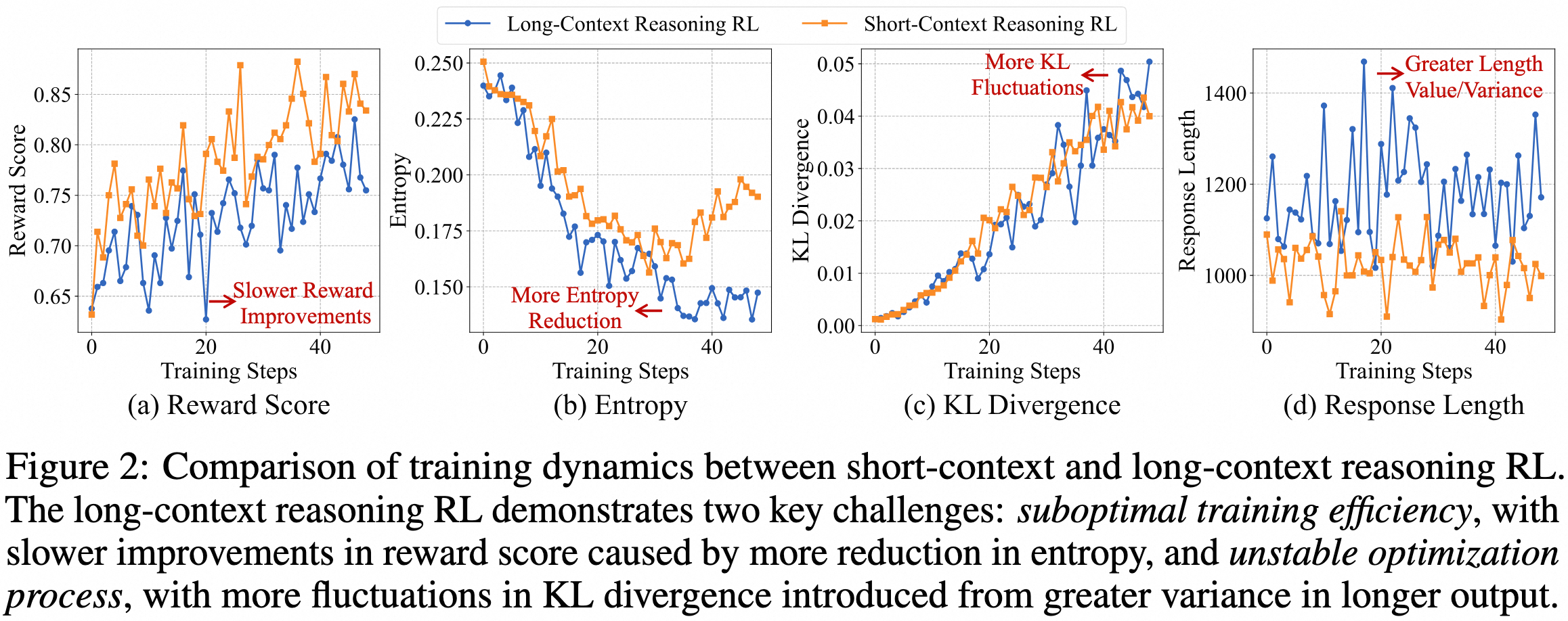 In this work, we propose QwenLong-L1, a novel reinforcement learning (RL) framework designed to facilitate the transition of LRMs from short-context proficiency to robust long-context generalization. In our preliminary experiments, we illustrate the differences between the training dynamics of short-context and long-context reasoning RL.