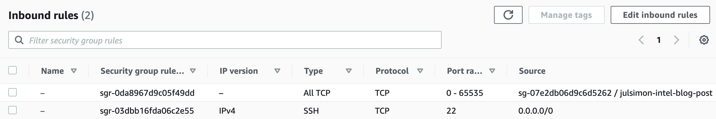 sshbetween the master instance (the one you'll launch training from) and all other instances (master included). - Open all TCP ports on all instances for oneCCL communication inside the cluster. Please make sure NOT to open these ports to the external world. AWS provides a convenient way to do this by only allowing connections from instances running a particular security group. Here's how my setup looks.