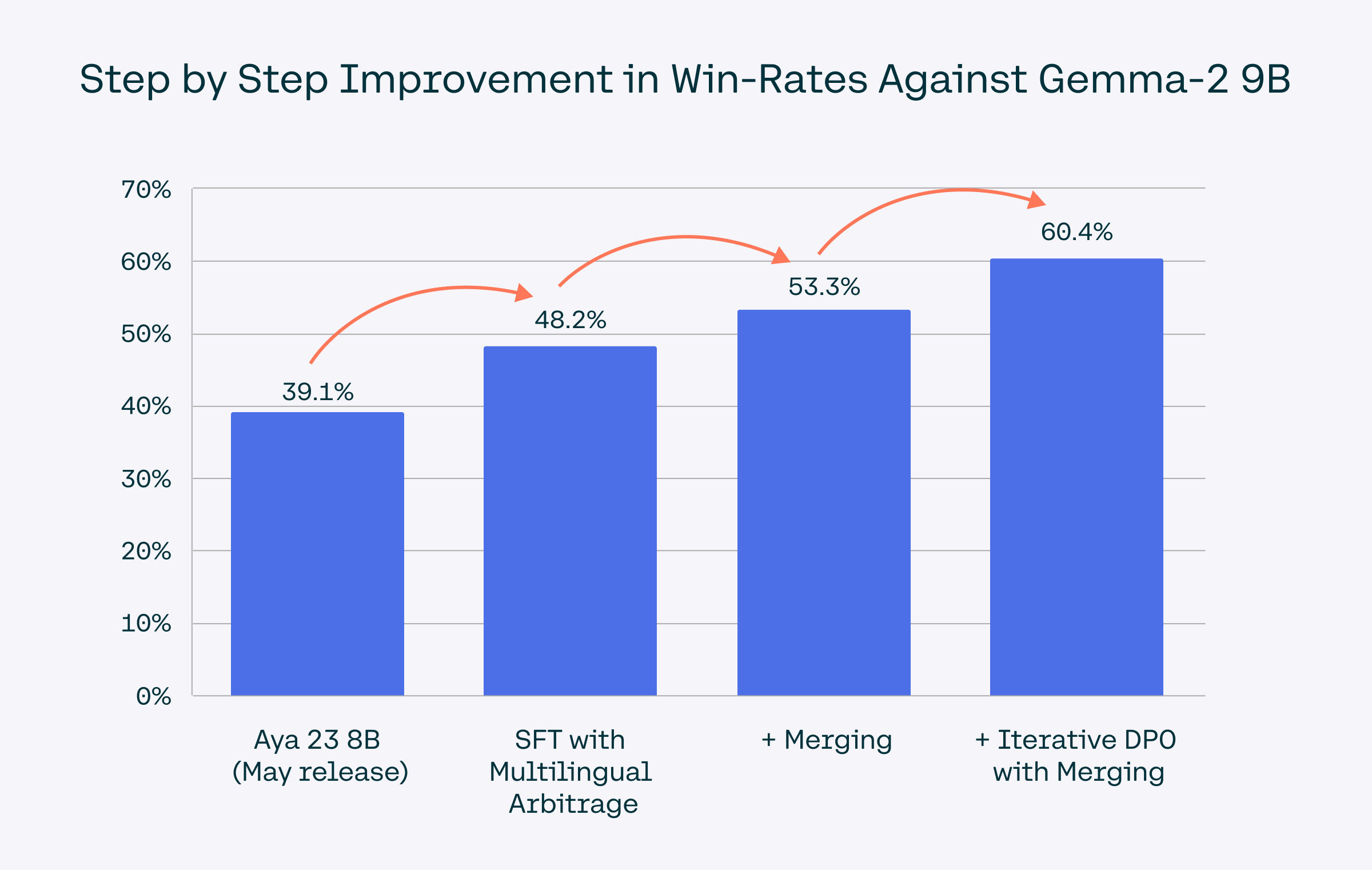 After offline preference training, we run online iterative DPO, where we sample multiple online generations for each prompt from the model trained during the last iteration, rank these generations with a Reward Model, and then further train on these preference pairs. For both models, we repeat this process for 3 iterations as we found that going beyond 3 iterations led to minimal gains at the cost of additional re-tuning parameters like regularization coefficient (beta) and sometimes introduced reward hacking behavior. Overall, for Aya Expanse 8B, the combination of offline and online preference training on top of the model trained with arbitrage, led to 7.1% additional gains in win rate against Gemma 2 9B.
