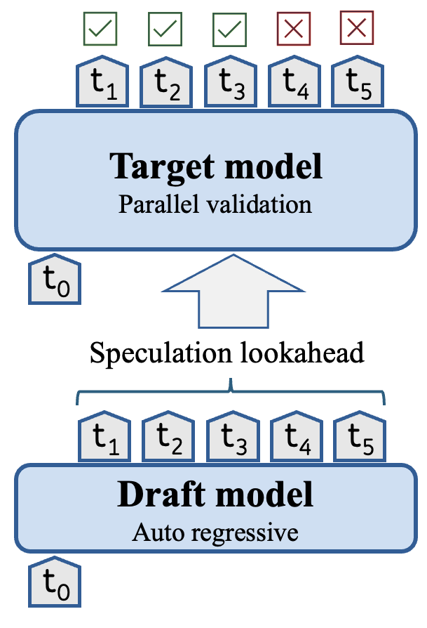 Speculative decoding is a popular technique to accelerate the inference of large language models, while preserving their accuracy. As shown in the figure below, speculative decoding works by splitting the generative process into two stages. In the first stage, a fast, but less accurate draft model (AKA assistant) autoregressively generates a sequence of tokens. In the second stage, a large, but more accurate target model conducts parallelized verification over the generated draft tokens. This process allows the target model to produce multiple tokens in a single forward pass and thus accelerate autoregressive decoding. The success of speculative decoding largely hinges on the speculation lookahead (SL), i.e. the number of tokens produced by the draft model in each iteration. In practice, the SL is either a static value or based on heuristics, neither of which is optimal for squeezing out maximium performance during inference.
