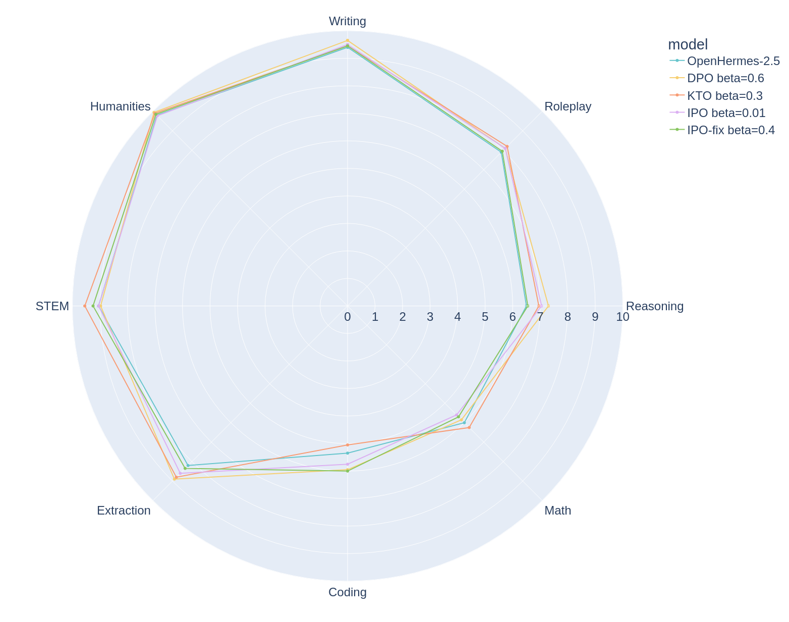 While the observations about each algorithm remain the same with OpenHermes, that is that DPO > KTO > IPO, the sweet spot for varies wildly with each algorithm. With the best choice of for DPO, KTO and IPO being 0.6, 0.3 and 0.01 respectively.