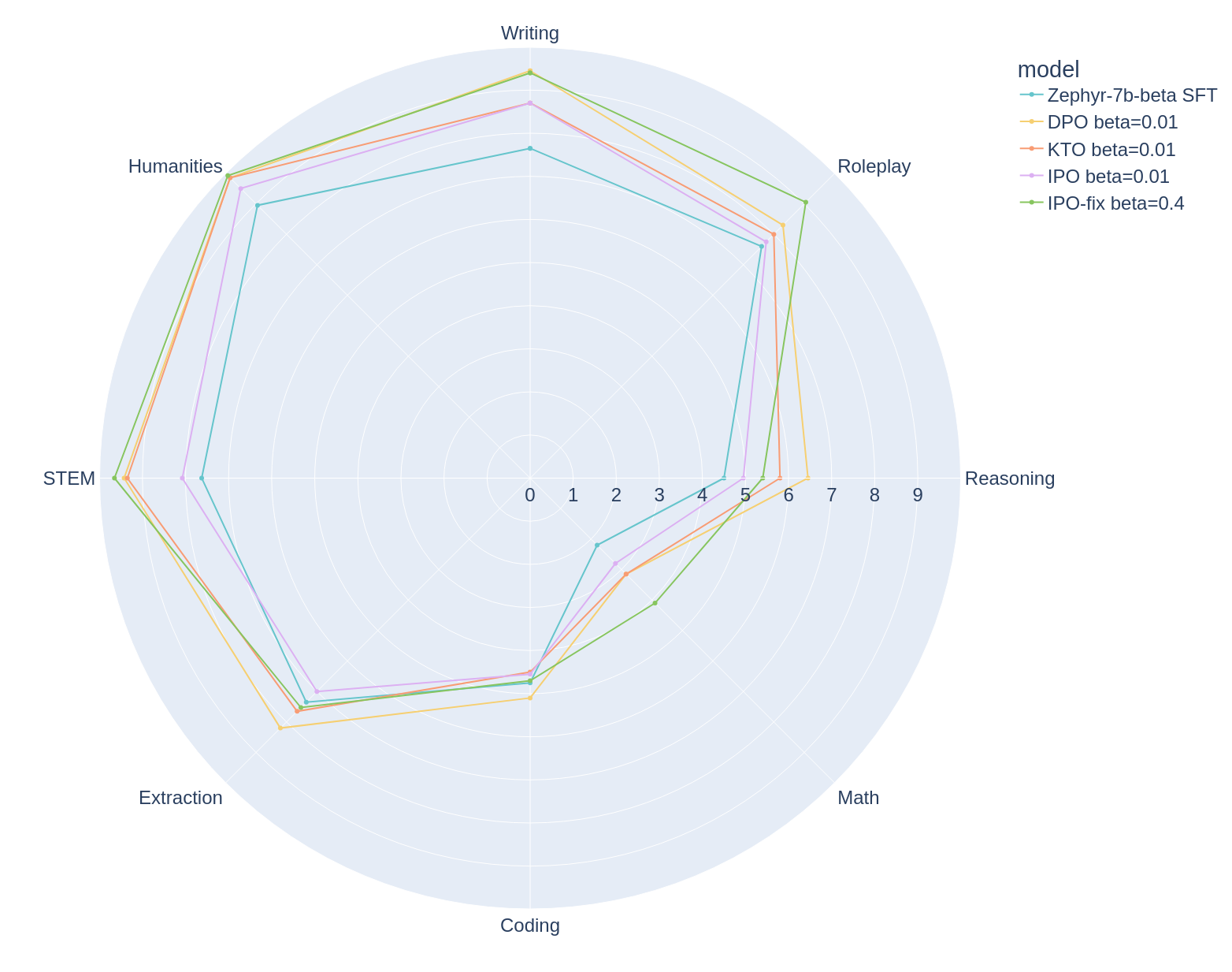 For the Zephyr model, we observed that the best performance was achieved with the lowest value, 0.01. This is consistent across all three of the algorithms tested, an interesting follow on experiment for the community would be a fine grained scan in the range of 0.0-0.2. While DPO can achieve the highest MT Bench score, we found that KTO (paired) achieves better results in all but one setting. IPO, while having stronger theoretical guarantees, appears to be worse than the base model in all but one setting.