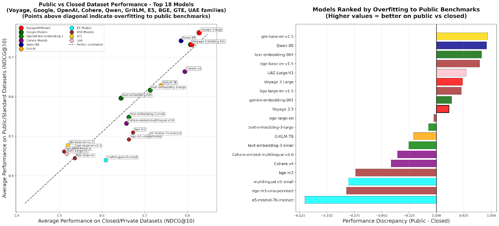 This hybrid approach encourages the development of models with broad, robust generalization. A model with a significant performance drop between the open and the private datasets would suggest overfitting, providing a clear signal to the community. This is already apparent with some models, which show a notable drop in performance on RTEB's private datasets.