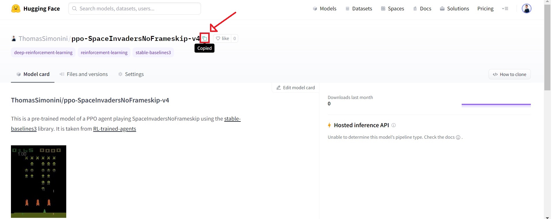 Weโre currently uploading saved models of agents playing Space Invaders, Breakout, LunarLander and more. On top of this, you can find all stable-baselines-3 models from the community here