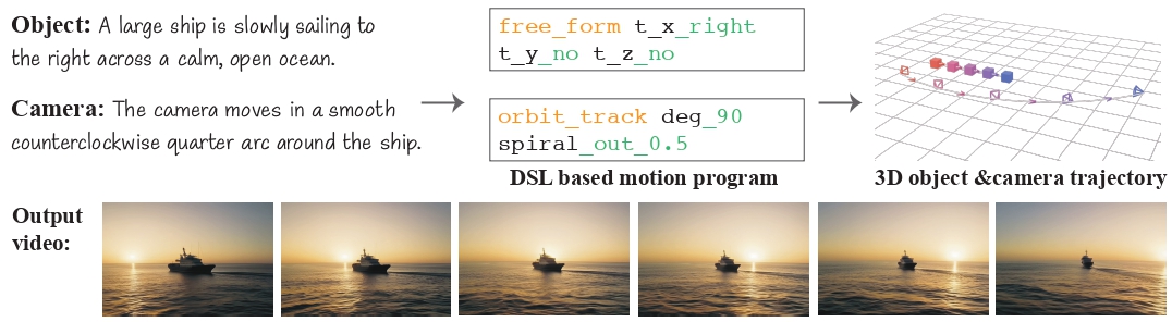 In LAMP, users act as a director, providing natural language descriptions for both object and camera behaviors. The system translates these prompts into precise 3D Motion Programs and conditions the video generation process to produce cinematic shots.