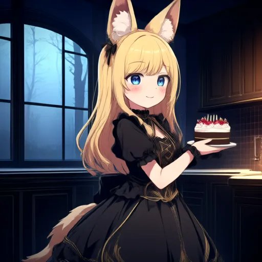 - anime style anime girl with massive fennec ears and one big fluffy tail, she has blonde long hair blue eyes wearing a maid outfit with a long black gold leaf pattern dress, walking slowly to the front with sweetie smile, holding a fancy black forest cake with candles on top in the kitchen of an old dark Victorian mansion lit by candlelight with a bright window to the foggy forest