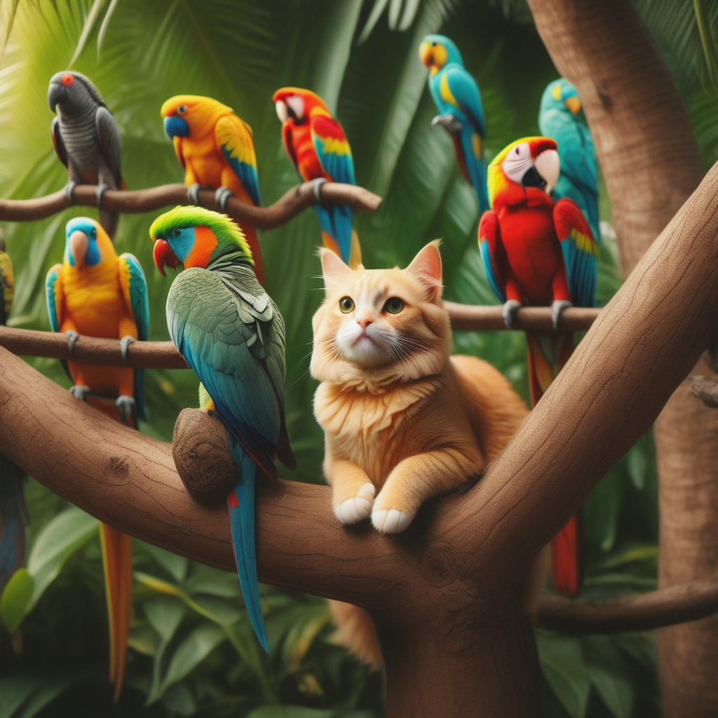 - Cat on a tree sitting in between parrots.