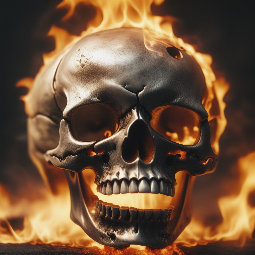 - cinimatic closeup of burning skull
