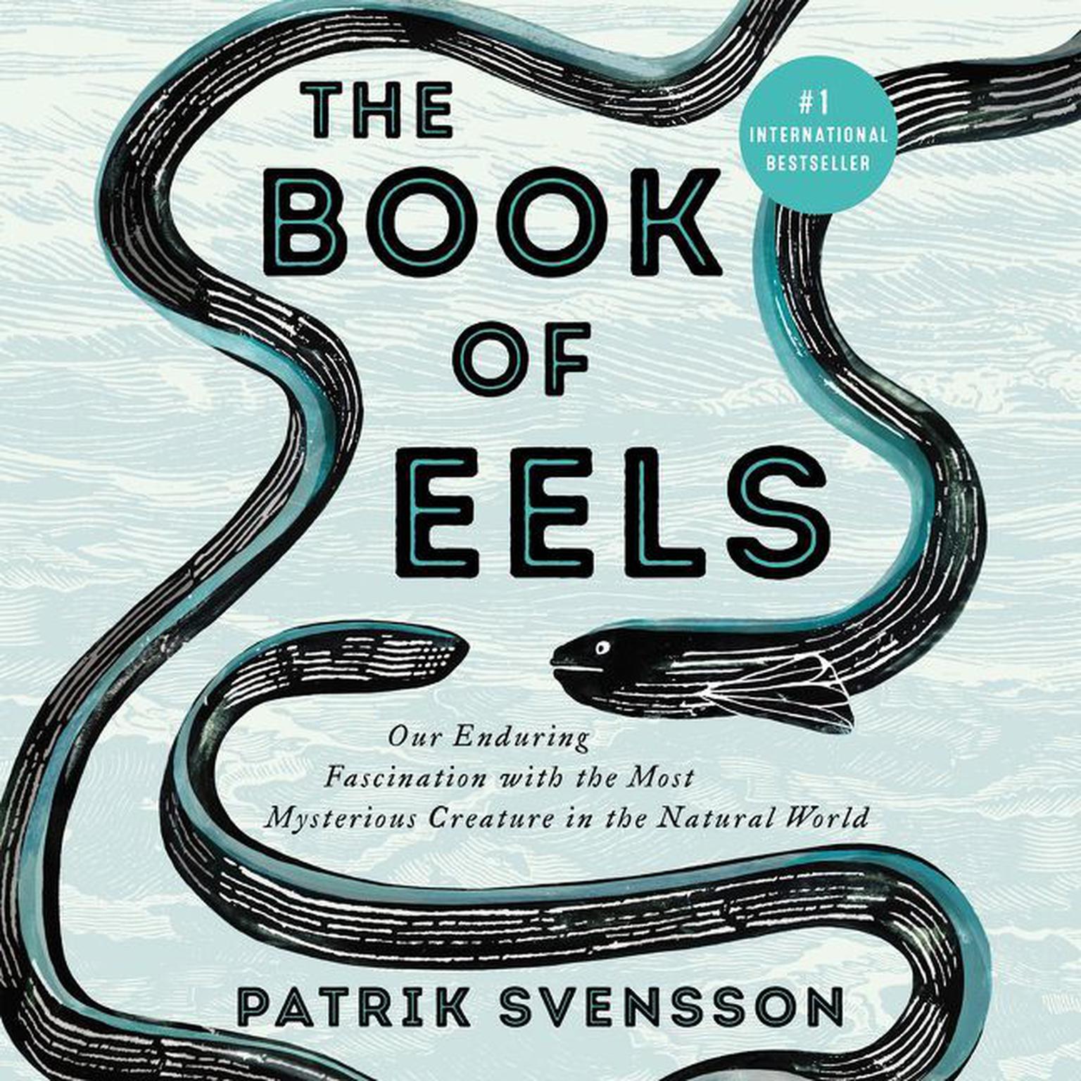 This is the cover of "The Book of Eels" by Patrik Svensson, featuring stylized eel illustrations and textured background, indicating its content about natural history and eels' mystery. It's designed with an artistic and educational intent, features with a subtitle information and a bestseller badge on the cover.