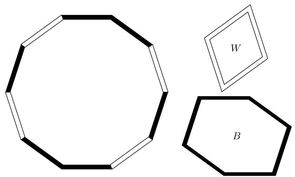 Let $b \geq 2$ and $w \geq 2$ be fixed integers, and $n=b+w$. Given are $2 b$ identical black rods and $2 w$ identical white rods, each of side length 1. We assemble a regular $2 n$-gon using these rods so that parallel sides are the same color. Then, a convex $2 b$-gon $B$ is formed by translating the black rods, and a convex $2 w$-gon $W$ is formed by translating the white rods. An example of one way of doing the assembly when $b=3$ and $w=2$ is shown below, as well as the resulting polygons $B$ and $W$.  Prove that the difference of the areas of $B$ and $W$ depends only on the numbers $b$ and $w$, and not on how the $2 n$-gon was assembled.