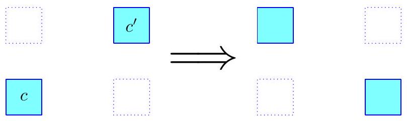 Claim - There exists a transversal $T_{a}$ with at least $a$ amber cells. Analogously, there exists a transversal $T_{b}$ with at least $b$ bronze cells. $$ \frac{a^{2}+a b-b}{a+b+1}=(a-1)+\frac{1}{a+b+1}>a-1 $$ Now imagine we transform $T_{a}$ to $T_{b}$ in some number of steps, by repeatedly choosing cells $c$ and $c^{\prime}$ and swapping them with the two other corners of the rectangle formed by their row/column, as shown in the figure.  By "discrete intermediate value theorem", the number of amber cells will be either $a$ or $a+1$ at some point during this transformation. This completes the proof.