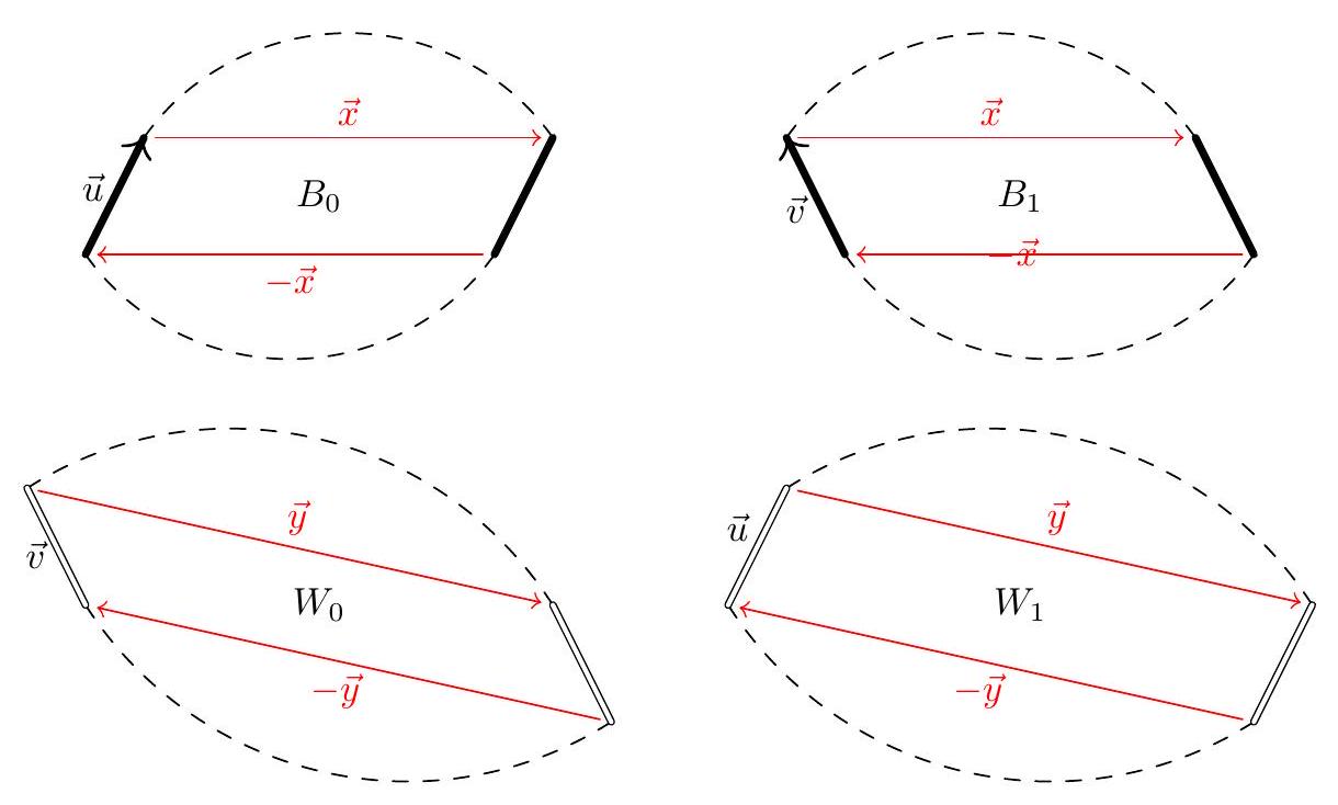 We are going to prove that one may swap a black rod with an adjacent white rod (as well as the rods parallel to them) without affecting the difference in the areas of $B-W$. Let $\vec{u}$ and $\vec{v}$ denote the originally black and white vectors that were adjacent on the $2 n$-gon and are now going to be swapped. Let $\vec{x}$ denote the sum of all the other black vectors between $\vec{u}$ and $-\vec{u}$, and define $\vec{y}$ similarly. See the diagram below, where $B_{0}$ and $W_{0}$ are the polygons before the swap, and $B_{1}$ and $W_{1}$ are the resulting changed polygons.  Observe that the only change in $B$ and $W$ is in the parallelograms shown above in each diagram. Letting $\wedge$ denote the wedge product, we need to show that $$ \vec{u} \wedge \vec{x}-\vec{v} \wedge \vec{y}=\vec{v} \wedge \vec{x}-\vec{u} \wedge \vec{y} $$ which can be rewritten as $$ (\vec{u}-\vec{v}) \wedge(\vec{x}+\vec{y})=0 $$ In other words, it would suffice to show $\vec{u}-\vec{v}$ and $\vec{x}+\vec{y}$ are parallel. (Students not familiar with wedge products can replace every $\wedge$ with the cross product $\times$ instead.) Claim - Both $\vec{u}-\vec{v}$ and $\vec{x}+\vec{y}$ are perpendicular to vector $\vec{u}+\vec{v}$. For the other perpendicularity, note that $\vec{u}+\vec{v}+\vec{x}+\vec{y}$ traces out a diameter of the circumcircle of the original $2 n$-gon; call this diameter $A B$, so $$ A+\vec{u}+\vec{v}+\vec{x}+\vec{y}=B $$ Now point $A+\vec{u}+\vec{v}$ is a point on this semicircle, which means (by the inscribed angle theorem) the angle between $\vec{u}+\vec{v}$ and $\vec{x}+\vec{y}$ is $90^{\circ}$.