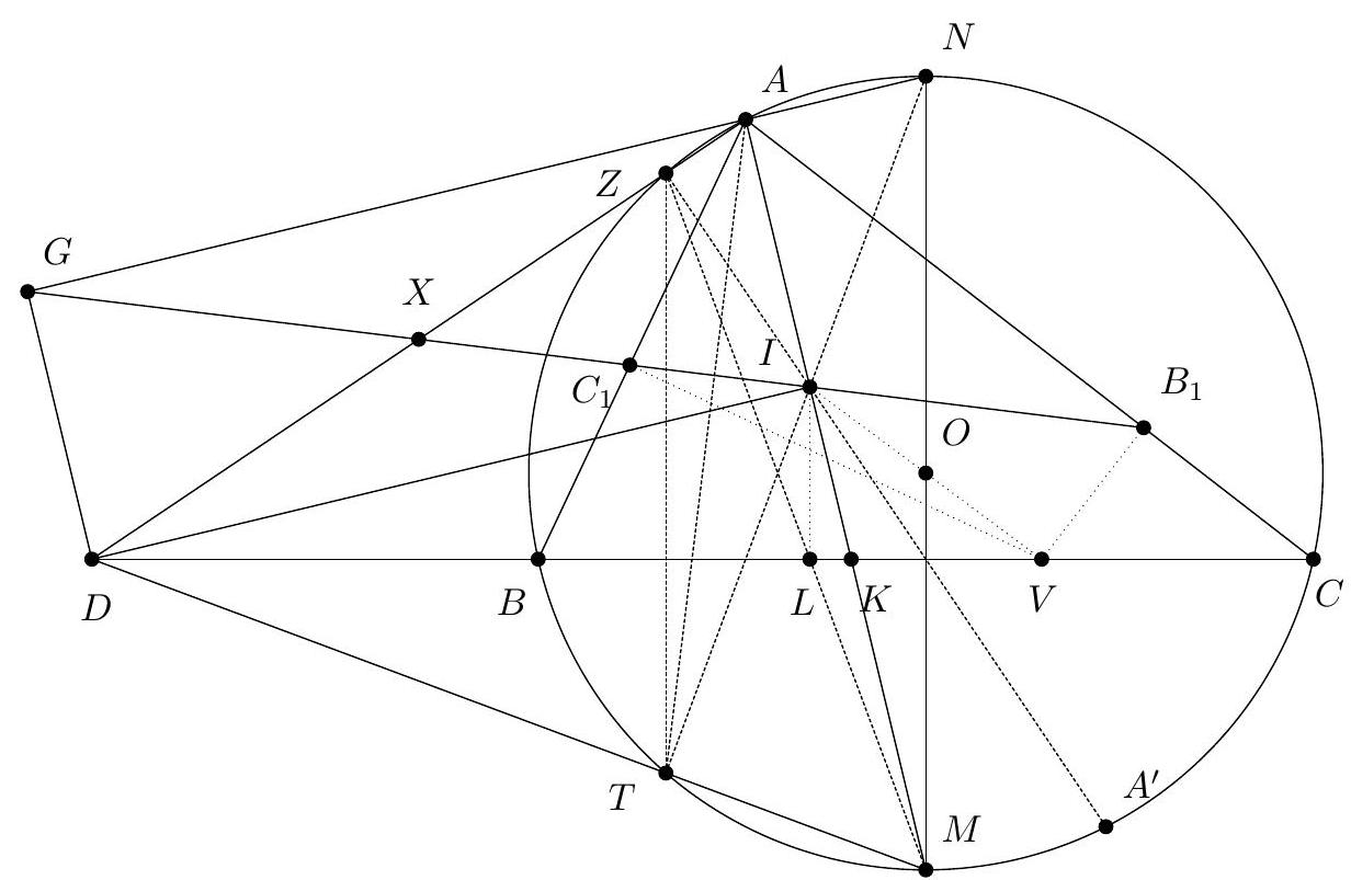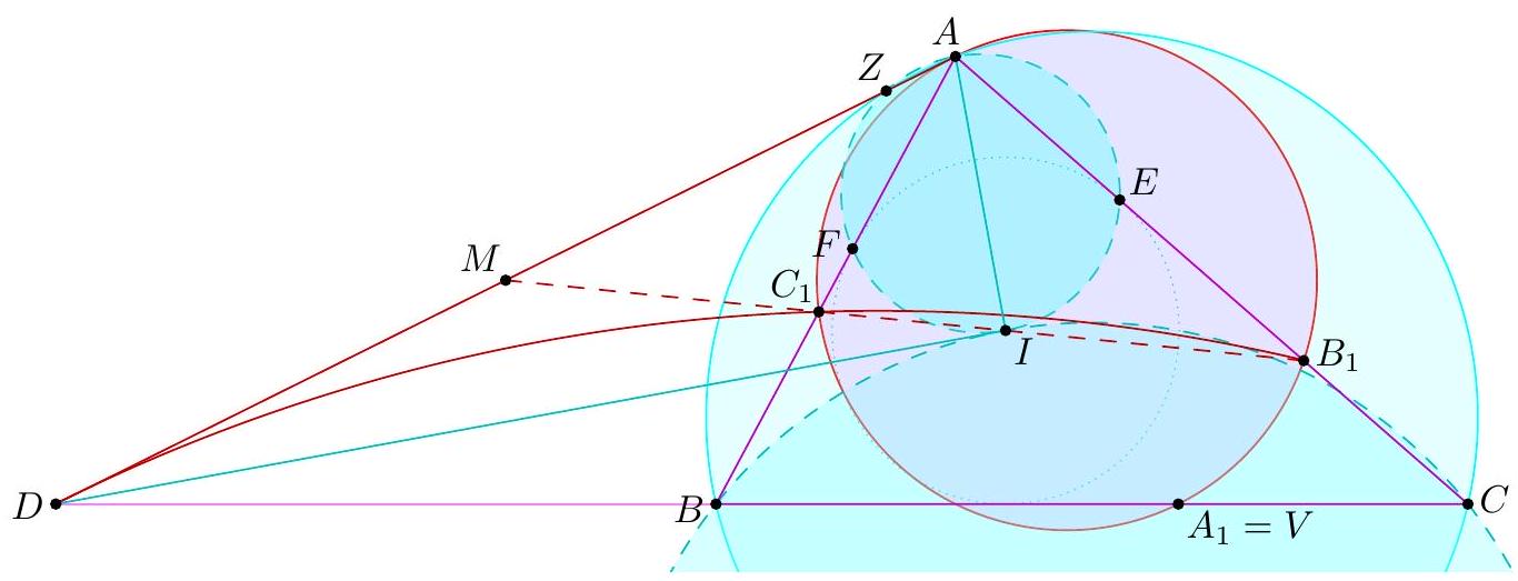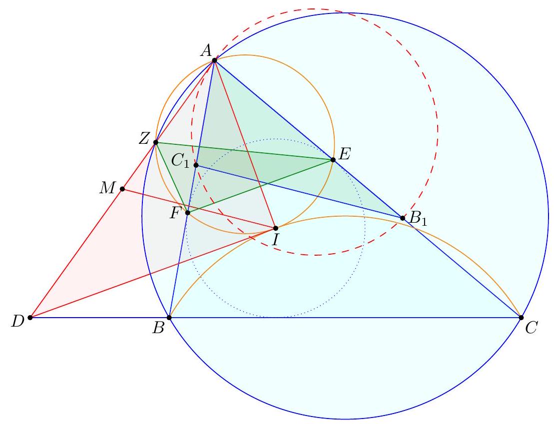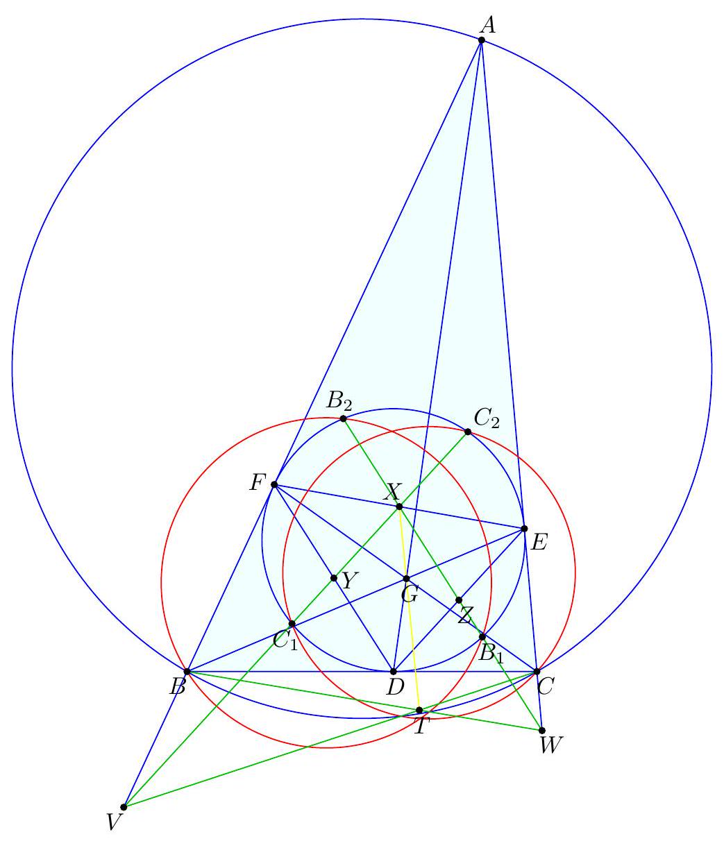 \I First solution (Allen Liu). Let $X, Y, Z$ be midpoints of $E F, F D, D E$, and let $G$ be the Gergonne point. By radical axis on $(A E I F),(D E F),(A I C)$ we see that $B_{1}$, $X, B_{2}$ are collinear. Likewise, $B_{1}, Z, B_{2}$ are collinear, so lines $B_{1} B_{2}$ and $X Z$ coincide. Similarly, lines $C_{1} C_{2}$ and $X Y$ coincide. In particular lines $B_{1} B_{2}$ and $C_{1} C_{2}$ meet at $X$.  Note $G$ is the symmedian point of $D E F$, so it is well-known that $X G$ passes through the midpoint of $D K$. So we just have to prove $G$ lies on the radical axis. First, note that $\triangle D E F$ is the cevian triangle of the Gergonne point $G$. Set $V=$ $\overline{X Y} \cap \overline{A B}, W=\overline{X Z} \cap \overline{A C}$, and $T=\overline{B W} \cap \overline{C V}$. We begin with the following completely projective claim. Claim - The points $X, G, T$ are collinear. - By Cevian Nest on $\triangle A B C$, it follows that $\overline{A X}, \overline{B Y}, \overline{C Z}$ are concurrent. - Hence $\triangle B Y V$ and $\triangle C Z W$ are perspective. - Hence $\triangle B Z W$ and $\triangle C Y V$ are perspective too. - Hence we deduce by Desargues theorem that $T, X$, and $\overline{B Z} \cap \overline{C Y}$ are collinear. - Finally, the Cevian Nest theorem applied on $\triangle G B C$ (which has cevian triangles $\triangle D F E, \triangle X Z Y$ ) we deduce $G, X$, and $\overline{B Z} \cap \overline{C Y}$, proving the claim. One could also proceed by using barycentric coordinates on $\triangle D E F$. Remark (Eric Shen). The first four bullets can be replaced by non-projective means: one can check that $\overline{B Z} \cap \overline{C Y}$ is the radical center of $(B I C),\left(B B_{1} B_{2}\right),\left(C C_{1} C_{2}\right)$ and therefore it lies on line $\overline{X T}$. Now, we contend point $V$ is the radical center $\left(C C_{1} C_{2}\right),(A B C)$ and $(D E F)$. To see this, let $V^{\prime}=\overline{E D} \cap \overline{A B}$; then $\left(F V^{\prime} ; A B\right)$ is harmonic, and $V$ is the midpoint of $\overline{F V^{\prime}}$, and thus $V A \cdot V B=V F^{2}=V C_{1} \cdot V C_{2}$. So in fact $\overline{C V}$ is the radical axis of $(A B C)$ and $\left(C C_{1} C_{2}\right)$. Similarly, $\overline{B W}$ is the radical axis of $(A B C)$ and $\left(B B_{1} B_{2}\right)$. Thus $T$ is the radical center of $(A B C),\left(B B_{1} B_{2}\right),\left(C C_{1} C_{2}\right)$.