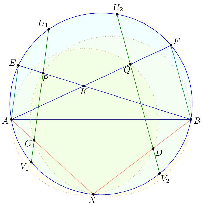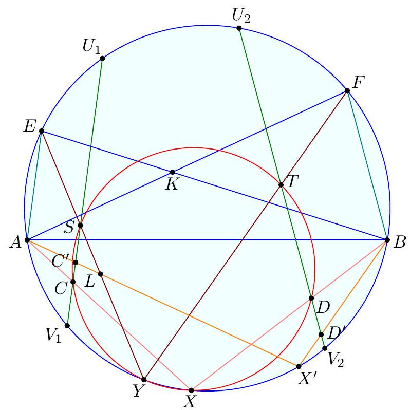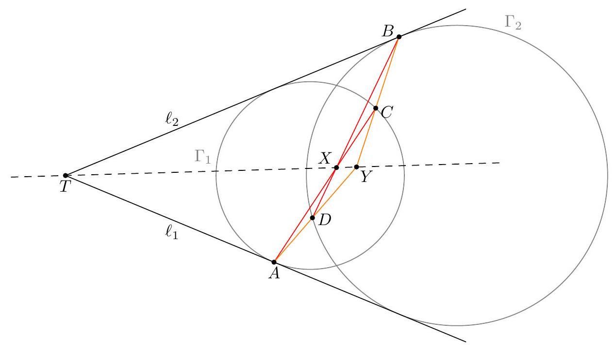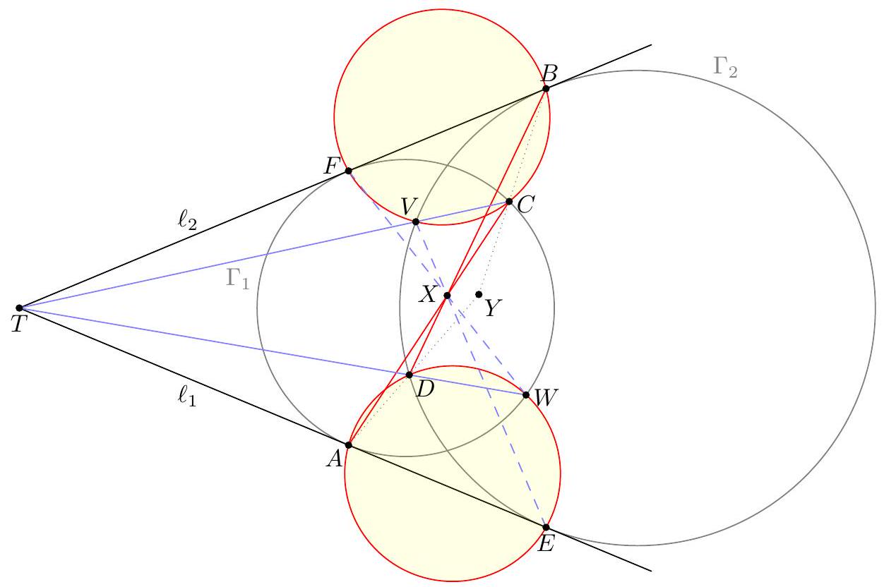 \I First solution (Allen Liu). Let $X, Y, Z$ be midpoints of $E F, F D, D E$, and let $G$ be the Gergonne point. By radical axis on $(A E I F),(D E F),(A I C)$ we see that $B_{1}$, $X, B_{2}$ are collinear. Likewise, $B_{1}, Z, B_{2}$ are collinear, so lines $B_{1} B_{2}$ and $X Z$ coincide. Similarly, lines $C_{1} C_{2}$ and $X Y$ coincide. In particular lines $B_{1} B_{2}$ and $C_{1} C_{2}$ meet at $X$.  Note $G$ is the symmedian point of $D E F$, so it is well-known that $X G$ passes through the midpoint of $D K$. So we just have to prove $G$ lies on the radical axis. First, note that $\triangle D E F$ is the cevian triangle of the Gergonne point $G$. Set $V=$ $\overline{X Y} \cap \overline{A B}, W=\overline{X Z} \cap \overline{A C}$, and $T=\overline{B W} \cap \overline{C V}$. We begin with the following completely projective claim. Claim - The points $X, G, T$ are collinear. - By Cevian Nest on $\triangle A B C$, it follows that $\overline{A X}, \overline{B Y}, \overline{C Z}$ are concurrent. - Hence $\triangle B Y V$ and $\triangle C Z W$ are perspective. - Hence $\triangle B Z W$ and $\triangle C Y V$ are perspective too. - Hence we deduce by Desargues theorem that $T, X$, and $\overline{B Z} \cap \overline{C Y}$ are collinear. - Finally, the Cevian Nest theorem applied on $\triangle G B C$ (which has cevian triangles $\triangle D F E, \triangle X Z Y$ ) we deduce $G, X$, and $\overline{B Z} \cap \overline{C Y}$, proving the claim. One could also proceed by using barycentric coordinates on $\triangle D E F$. Remark (Eric Shen). The first four bullets can be replaced by non-projective means: one can check that $\overline{B Z} \cap \overline{C Y}$ is the radical center of $(B I C),\left(B B_{1} B_{2}\right),\left(C C_{1} C_{2}\right)$ and therefore it lies on line $\overline{X T}$. Now, we contend point $V$ is the radical center $\left(C C_{1} C_{2}\right),(A B C)$ and $(D E F)$. To see this, let $V^{\prime}=\overline{E D} \cap \overline{A B}$; then $\left(F V^{\prime} ; A B\right)$ is harmonic, and $V$ is the midpoint of $\overline{F V^{\prime}}$, and thus $V A \cdot V B=V F^{2}=V C_{1} \cdot V C_{2}$. So in fact $\overline{C V}$ is the radical axis of $(A B C)$ and $\left(C C_{1} C_{2}\right)$. Similarly, $\overline{B W}$ is the radical axis of $(A B C)$ and $\left(B B_{1} B_{2}\right)$. Thus $T$ is the radical center of $(A B C),\left(B B_{1} B_{2}\right),\left(C C_{1} C_{2}\right)$.