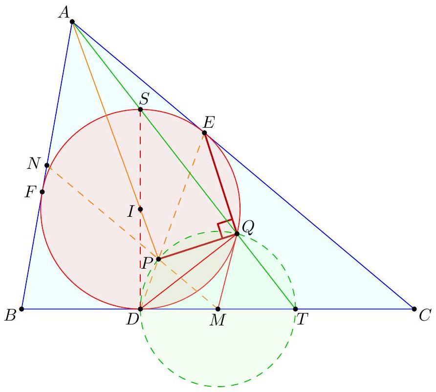 First, we claim that $D, P, E$ are collinear. Let $N$ be the midpoint of $\overline{A B}$. It is well-known that the three lines $M N, D E, A I$ are concurrent at a point (see for example problem 6 of USAJMO 2014). Let $P^{\prime}$ be this intersection point, noting that $P^{\prime}$ actually lies on segment $D E$. Then $P^{\prime}$ lies inside $\triangle A B C$ and moreover $$ \triangle D P^{\prime} M \sim \triangle D E C $$ so $M P^{\prime}=M D$. Hence $P^{\prime}=P$, proving the claim. Let $S$ be the point diametrically opposite $D$ on the incircle, which is also the second intersection of $\overline{A Q}$ with the incircle. Let $T=\overline{A Q} \cap \overline{B C}$. Then $T$ is the contact point of the $A$-excircle; consequently, $$ M D=M P=M T $$ and we obtain a circle with diameter $\overline{D T}$. Since $\angle D Q T=\angle D Q S=90^{\circ}$ we have $Q$ on this circle as well. As $\overline{S D}$ is tangent to the circle with diameter $\overline{D T}$, we obtain $$ \angle P Q D=\angle S D P=\angle S D E=\angle S Q E . $$ Since $\angle D Q S=90^{\circ}, \angle P Q E=90^{\circ}$ too. γ Solution using spiral similarity. We will ignore for now the point $P$. As before define $S, T$ and note $\overline{A Q S T}$ collinear, as well as $D P Q T$ cyclic on circle $\omega$ with diameter $\overline{D T}$. Let $\tau$ be the spiral similarity at $Q$ sending $\omega$ to the incircle. We have $\tau(T)=D$, $\tau(D)=S, \tau(Q)=Q$. Now $$ I=\overline{D D} \cap \overline{Q Q} \Longrightarrow \tau(I)=\overline{S S} \cap \overline{Q Q} $$ and hence we conclude $\tau(I)$ is the pole of $\overline{A S Q T}$ with respect to the incircle, which lies on line $E F$. Then since $\overline{A I} \perp \overline{E F}$ too, we deduce $\tau$ sends line $A I$ to line $E F$, hence $\tau(P)$ must be either $E$ or $F$ as desired. γ Authorship comments. Written April 2014. I found this problem while playing with GeoGebra. Specifically, I started by drawing in the points $A, B, C, I, D, M, T$, common points. I decided to add in the circle with diameter $D T$, because of the synergy it had with the rest of the picture. After a while of playing around, I intersected ray $A I$ with the circle to get $P$, and was surprised to find that $D, P, E$ were collinear, which I thought was impossible since the setup should have been symmetric. On further reflection, I realized it was because $A I$ intersected the circle twice, and set about trying to prove this. I noticed the relation $\angle P Q E=90^{\circ}$ in my attempts to prove the result, even though this ended up being a corollary rather than a useful lemma.
