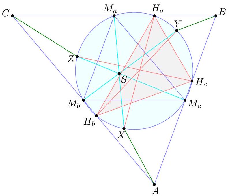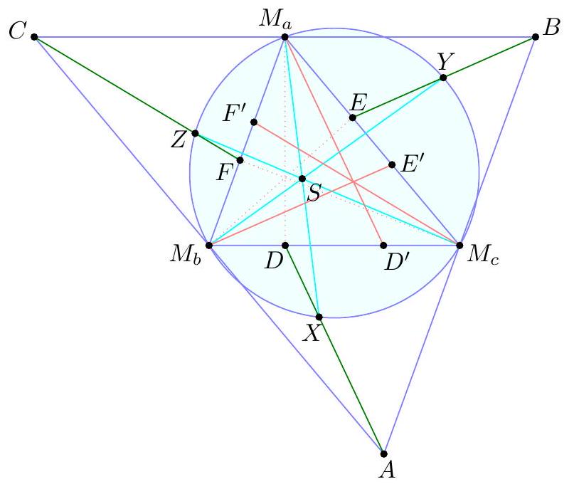 Let $A B C$ be a non-equilateral triangle and let $M_{a}, M_{b}, M_{c}$ be the midpoints of the sides $B C, C A, A B$, respectively. Let $S$ be a point lying on the Euler line. Denote by $X, Y, Z$ the second intersections of $M_{a} S, M_{b} S, M_{c} S$ with the nine-point circle. Prove that $A X, B Y, C Z$ are concurrent.