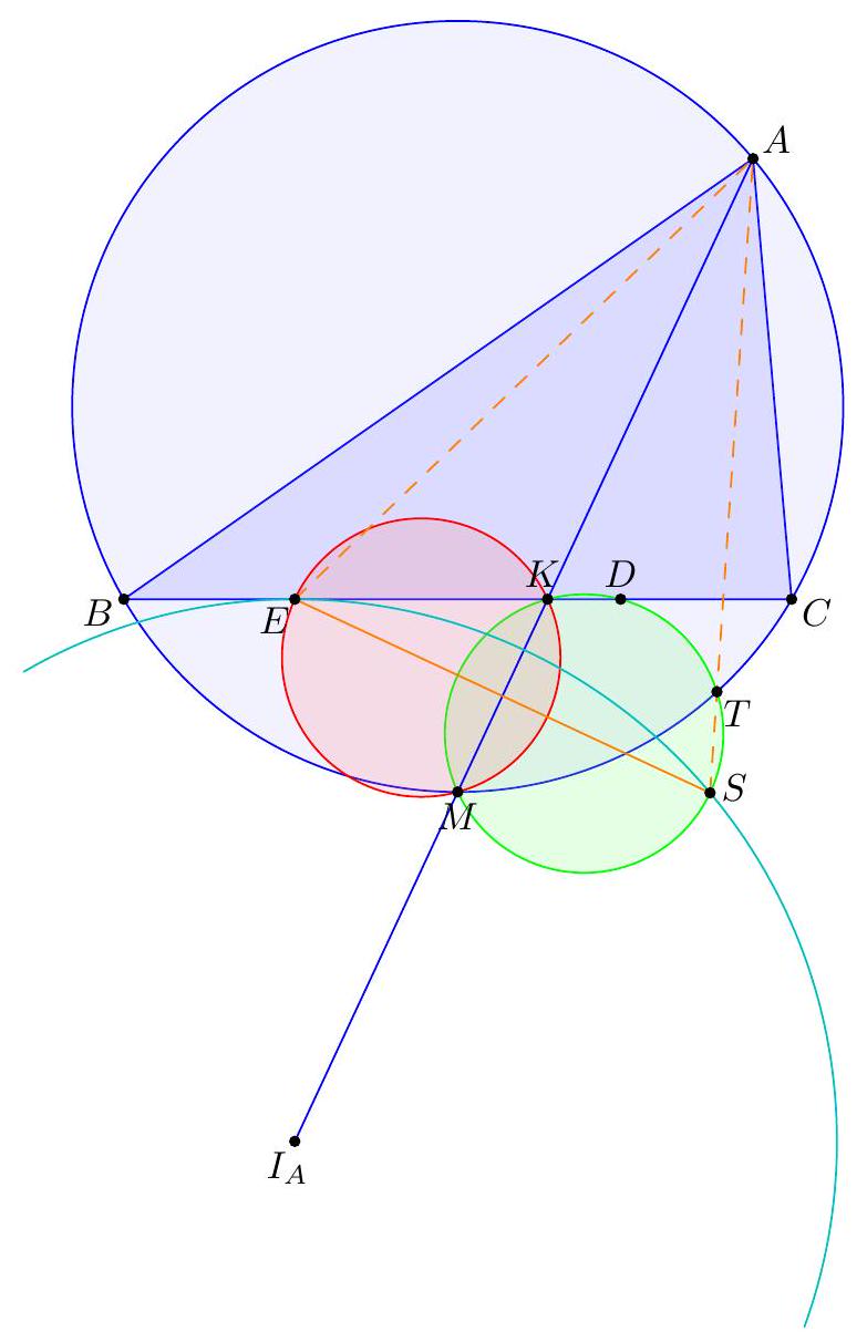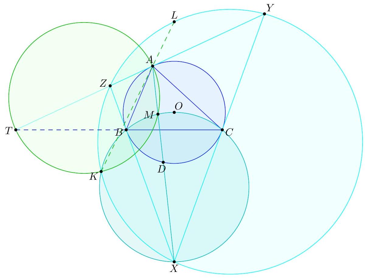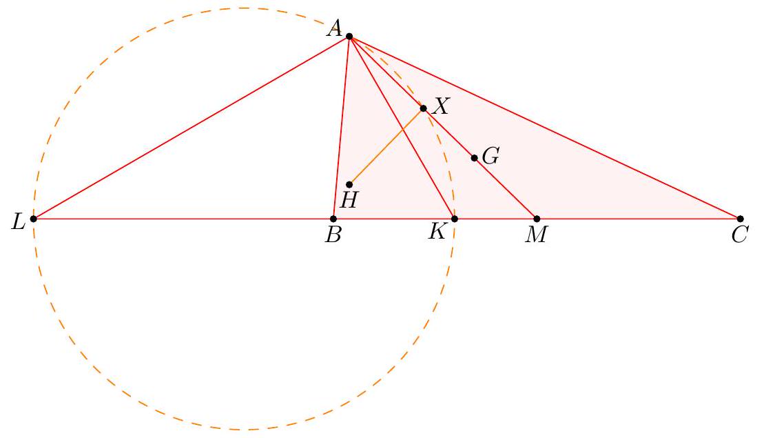 The main content of the problem: Claim - $\angle H X_{a} G=90^{\circ}$. This implies the result, since then the desired circumcenter is the midpoint of $\overline{G H}$. (This is the main difficulty; the Euler line is a red herring.) In what follows, we abbreviate $K_{a} L_{a}, M_{a}, X_{a}$ to $K, L, M, X$. First proof by Brokard. To do this, it suffices to show that $M$ has the same power with respect to the circle with diameter $\overline{A H}$ and the circle with diameter $\overline{K L}$. In fact I claim both circles are orthogonal to the circle with diameter $\overline{B C}$ ! The former follows from Brokard's theorem, noting that $A$ is on the polar of $H$, and the latter follows from the harmonic bundle.  Then $\overline{A M}$ is the radical axis, so $X$ lies on both circles.