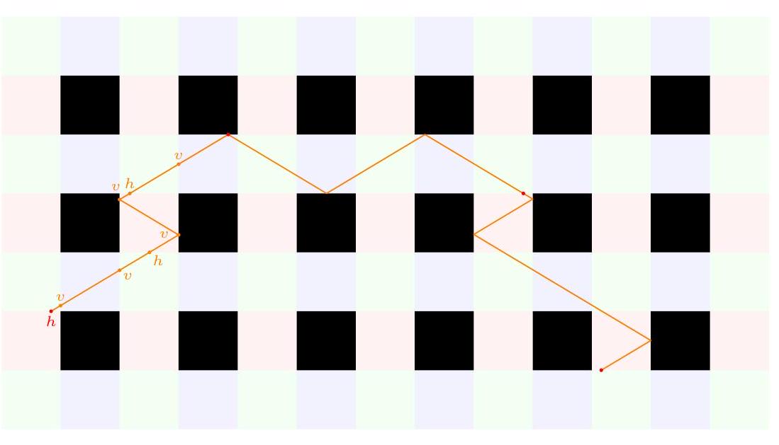 We re-color the white squares as red, blue, or green according as to whether they have a black square directly to the left/right, above/below, or neither, as shown below. Finally, we fix time zero to be a moment just before the laser passes a horizontal (WLOG) lattice line (not necessarily a wall). Shown below is an example for $(r, s)=(3,5)$.  The main idea is to keep track of every time the laser passes a lattice line (again, not necessarily a wall). There are four possible types of events: - A horizontal $h$ event where the laser switches from red to green (or vice-versa); - A horizontal $h$ event where the laser rebounds off a wall, remaining in a blue square, but flips the $x$-component of its velocity; - A vertical $v$ event where the laser switches from blue to green (or vice-versa) - A vertical $v$ event where the laser rebounds off a wall, remaining in a red square, but flips the $y$-component of its velocity. The first key observation is that: Claim - In the first second, the laser will encounter exactly $r$ horizontal events and $s$ vertical events. In every second after that, the same sequence of $r+s$ events occurs. We let the key-word be the sequence $w$ of $r+s$ letters corresponding to the sequence. For example, the picture above denotes an example with keyword $w=h v v h v v h v$; so no matter what, every second, the laser will encounter eight lattice lines, which are horizontal and vertical in that order. Claim - Color is periodic every 3 seconds. Now in a 3 -second period, consider the $3 r$ horizontal events and $3 s$ vertical events (both are odd). In order for the color to remain the same (as the only color changes are $R \leftrightarrow G$ for $h$ and $B \leftrightarrow G$ for $v$ ) there must have been an even number of color swaps for each orientation. Therefore there was an odd number of wall collisions of each orientation. So, the laser is pointing in the opposite direction at the end of 3 seconds. Finally, let $x_{t}$ be the fractional part of the $x$ coordinate after $t$ seconds (the $y$-coordinate is always zero by our setup at these moments). Note that $$ x_{t+1}= \begin{cases}x_{t} & \text { even number of vertical wall collisions } \\ 1-x_{t} & \text { odd numbers of vertical wall collisions }\end{cases} $$ Since over the there seconds there were an odd number of vertical collisions; it follows $x_{3}=1-x_{0}$. Thus at the end of three seconds, the laser is in a symmetric position from the start; and in 6 seconds it will form a closed loop.