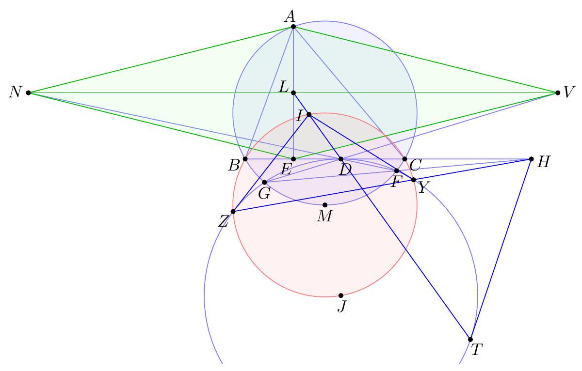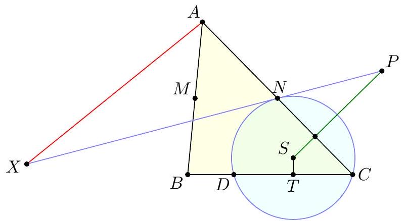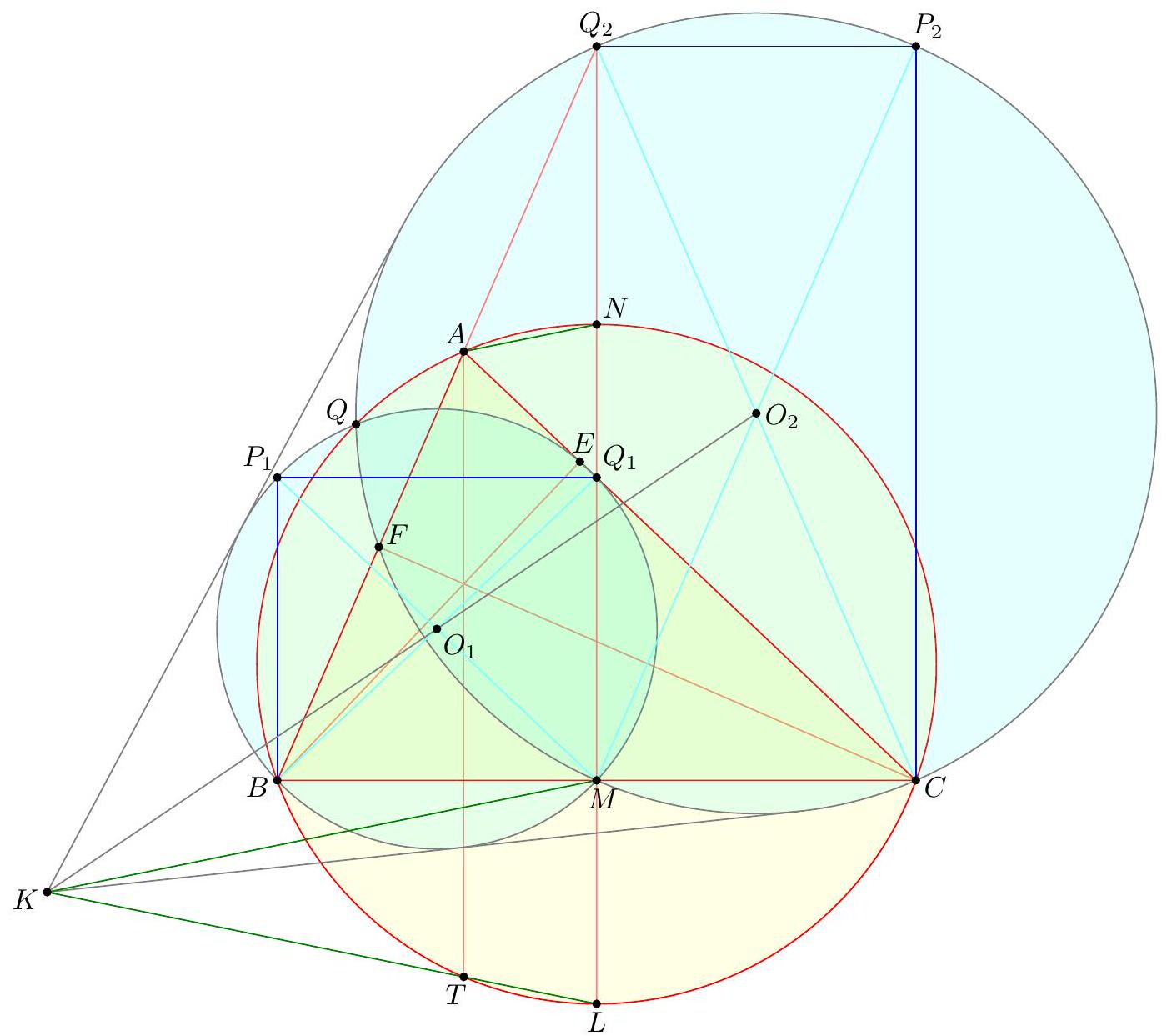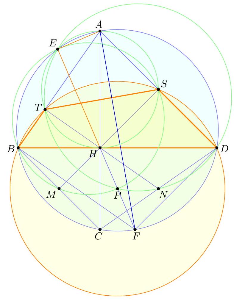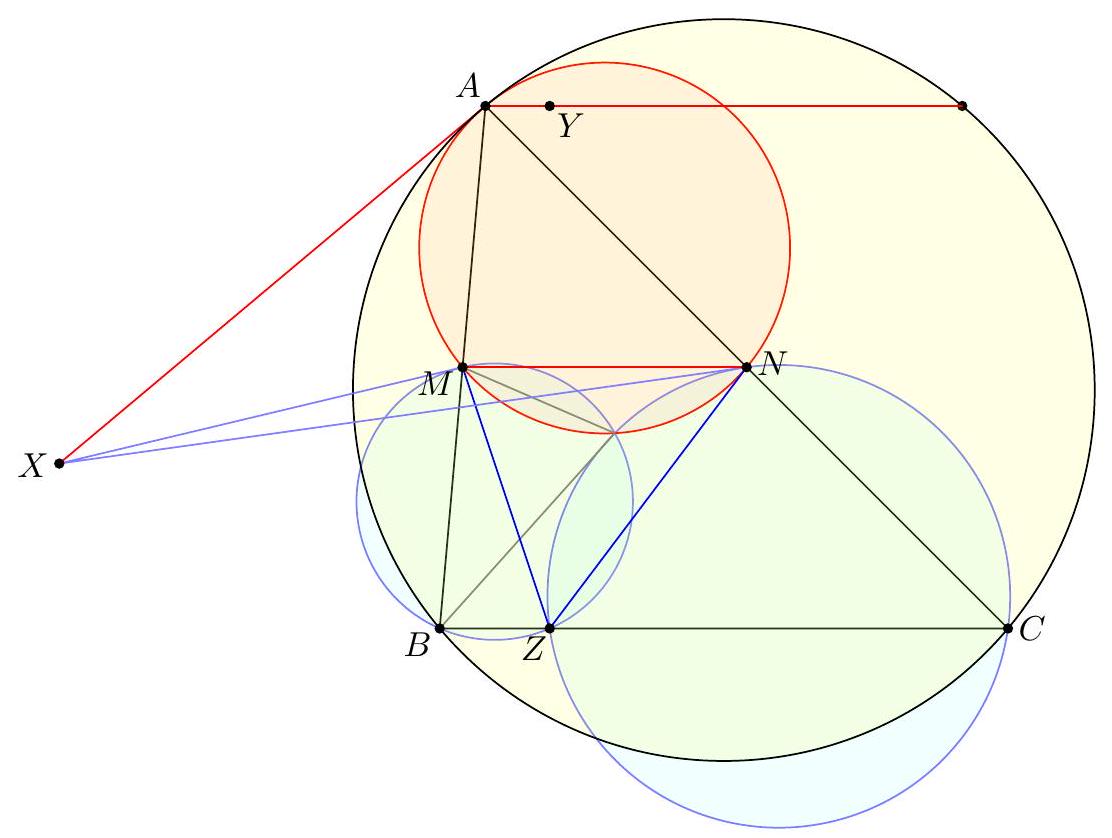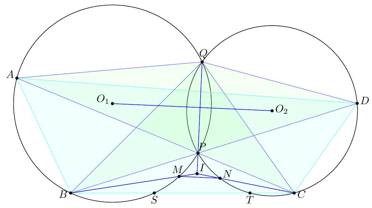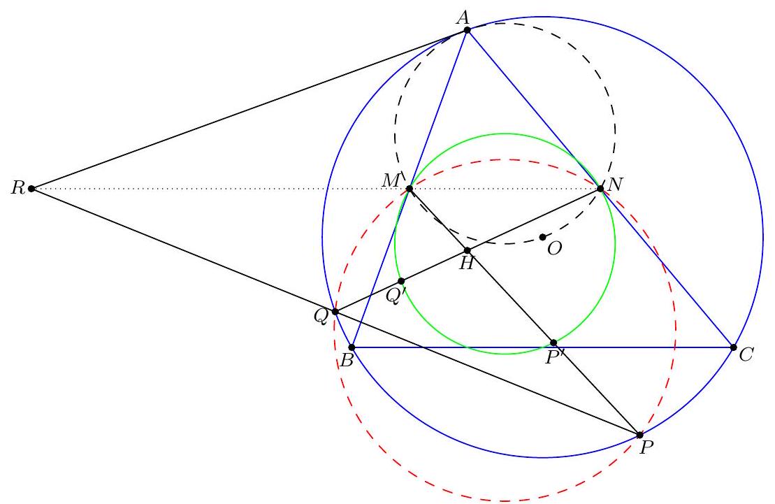 By angle chasing, equivalent to show $\overline{M N} \| \overline{A D}$, so discard the point $H$. We now present a three solutions. γ Third solution using barycentrics (mine). Once reduced to $\overline{M N} \| \overline{A B}$, straight bary will also work. By power of a point one obtains $$ \begin{aligned} P & =\left(a^{2}: 0: 2 b(b+c)-a^{2}\right) \\ Q & =\left(a^{2}: 2 c(b+c)-a^{2}: 0\right) \\ \Longrightarrow N & =\left(a^{2}(b+c): 2 b c(b+c)-b a^{2}: 2 b c(b+c)-c a^{2}\right) . \end{aligned} $$ Now the point at infinity along $\overline{A D}$ is $(-(b+c): b: c)$ and so we need only verify $$ \operatorname{det}\left[\begin{array}{ccc} a^{2}(b+c) & 2 b c(b+c)-b a^{2} & 2 b c(b+c)-c a^{2} \\ 0 & 1 & 1 \\ -(b+c) & b & c \end{array}\right]=0 $$ which follows since the first row is $-a^{2}$ times the third row plus $2 b c(b+c)$ times the second row.