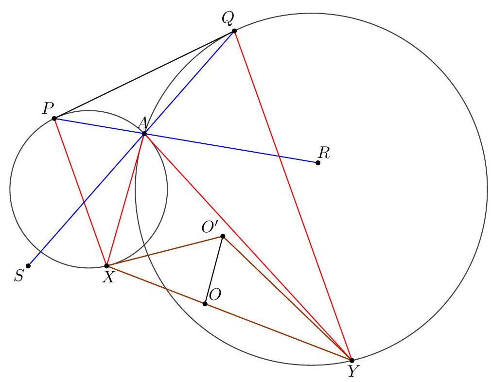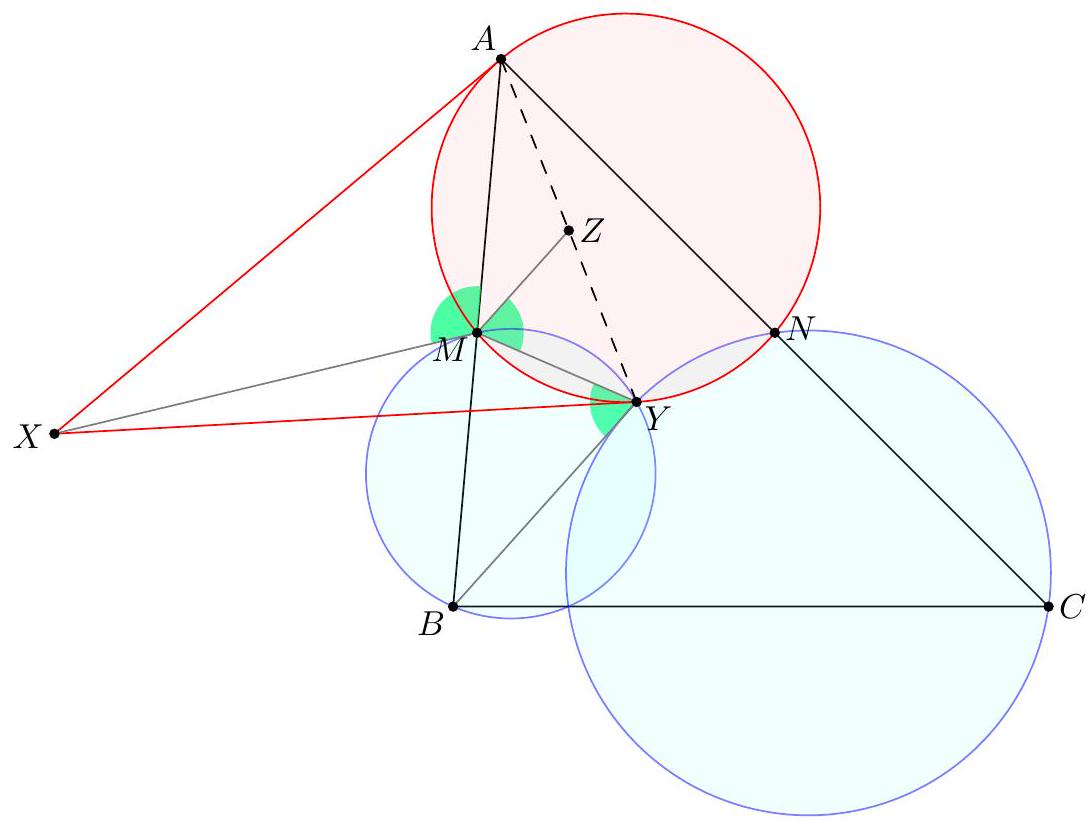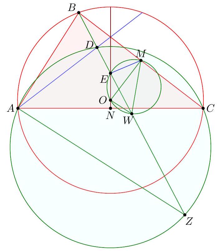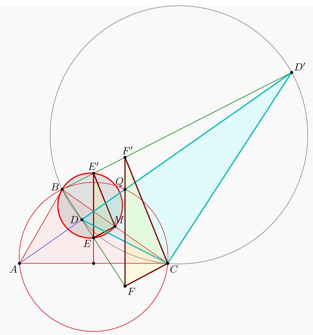 γ Most common synthetic approach. The solution hinges on the following claim: Claim - $Q$ coincides with the reflection of $D$ across $M$. $$ M B \cdot M Q=M A \cdot M P=M C \cdot M D $$ Since $M B=M C$, the claim follows. It follows that $\overline{M N} \| \overline{A D}$, as $M$ and $N$ are respectively the midpoints of $\overline{A Q}$ and $\overline{D Q}$. Thus $\overline{M N} \perp \overline{B C}$, and so $N$ lies on the perpendicular bisector of $\overline{B C}$, as needed. Remark (David Lin). One can prove the main claim without power of a point as well, as follows: Let $R$ be the foot from $B$ to $\overline{A M}$, so $B R C P$ is a parallelogram. Note that $A B D R$ is cyclic, and hence $$ \measuredangle D R M=\measuredangle D B A=Q B A=\measuredangle Q P A=\measuredangle Q P M $$ Thus, $\overline{D R} \| \overline{P Q}$, so $D R Q P$ is also a parallelogram.