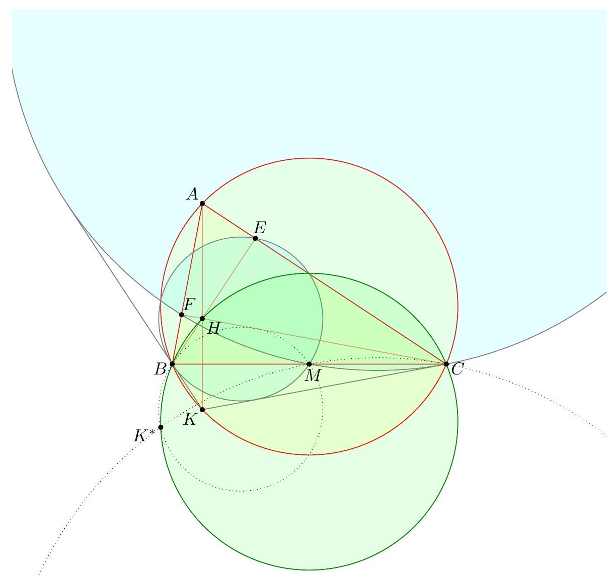 The main content of the problem: Claim - $\angle H X_{a} G=90^{\circ}$. This implies the result, since then the desired circumcenter is the midpoint of $\overline{G H}$. (This is the main difficulty; the Euler line is a red herring.) In what follows, we abbreviate $K_{a} L_{a}, M_{a}, X_{a}$ to $K, L, M, X$. Second proof by orthocenter reflection, Bendit Chan. As before, we know $M X \cdot M A=$ $M K \cdot M L=M B \cdot M C$, but $X$ lies inside segment $A M$. Construct parallelogram $A B A^{\prime} C$. Then $M X \cdot M A^{\prime}=M B \cdot M C$, so $X B A^{\prime} C$ is concyclic. However, it is well-known the circumcircle of $\triangle B A^{\prime} C$ (which is the reflection of $(A B C)$ across $\overline{B C}$ ) passes through $H$ and in fact has diameter $\overline{A^{\prime} H}$. So this gives $\angle H X A^{\prime}=90^{\circ}$ as needed.