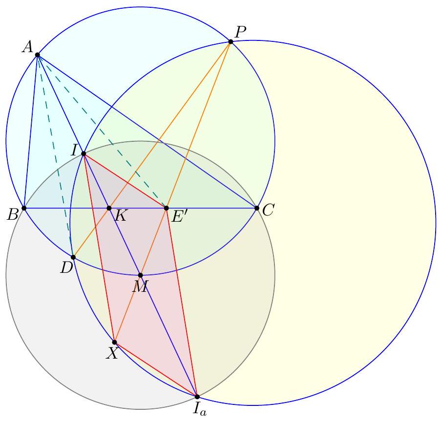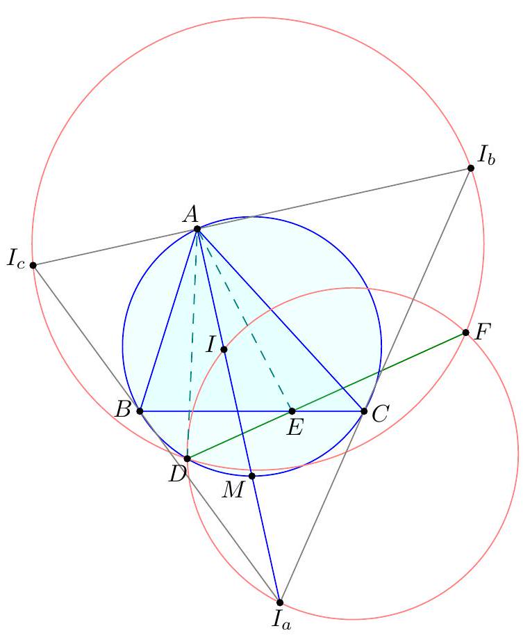 \I Barycentric coordinates (Carl Schildkraut). With reference triangle $\triangle A B C$, set $D=(r: s: t)$. Claim - The equations of $\left(D I I_{a}\right)$ and $\left(D I_{b} I_{c}\right)$ are, respectively, $$ \begin{aligned} & 0=-a^{2} y z-b^{2} z x-c^{2} x y+(x+y+z) \cdot\left(b c x-\frac{b c r}{c s-b t}(c y-b z)\right) \\ & 0=-a^{2} y z-b^{2} z x-c^{2} x y+(x+y+z) \cdot\left(-b c x+\frac{b c r}{c s+b t}(c y+b z)\right) . \end{aligned} $$ By EGMO Lemma 7.24, the radical axis is then given by $$ \overline{D F}: b c x-\frac{b c r}{c s-b t}(c y-b z)=-b c x+\frac{b c r}{c s+b t}(c y+b z) . $$ Now the point $$ \left(0: \frac{b^{2}}{s}: \frac{c^{2}}{t}\right)=\left(0: b^{2} t: c^{2} s\right) $$ lies on line $D F$ by inspection, and is obviously on line $B C$, hence it coincides with $E$. This lies on the isogonal of $\overline{A D}$ (by EGMO Lemma 7.6), as needed. γ Synthetic approach (Anant Mudgal). Focus on just $\left(D I I_{a}\right)$. Let $P$ be the second intersection of $\left(D I I_{a}\right)$ with $(A B C)$, and let $M$ be the midpoint of minor arc $\widehat{B C}$. Then by radical axis, lines $A M, D P$, and $B C$ are concurrent at a point $K$. Let $E^{\prime}=\overline{P M} \cap \overline{B C}$.  Claim - We have $\measuredangle B A D=\measuredangle E^{\prime} A C$. $$ \measuredangle K A E^{\prime}=\measuredangle K P E^{\prime}=\measuredangle D P M=\measuredangle D A M $$ Claim - The power of point $E^{\prime}$ with respect to $\left(D I I_{a}\right)$ is $2 E^{\prime} B \cdot E^{\prime} C$. $$ \measuredangle X I_{a} I=\measuredangle I_{a} I E^{\prime}=\measuredangle M I E^{\prime}=\measuredangle M P I=\measuredangle X P I $$ Hence $X$ lies on $\left(D I I_{a}\right)$, and $E^{\prime} X \cdot E^{\prime} P=2 E^{\prime} M \cdot E^{\prime} P=2 E^{\prime} B \cdot E^{\prime} C$. Repeat the argument on $\left(D I_{b} I_{c}\right)$; the same point $E^{\prime}$ (because of the first claim) then has power $2 E^{\prime} B \cdot E^{\prime} C$ with respect to $\left(D I_{b} I_{c}\right)$. Hence $E^{\prime}$ lies on the radical axis of $\left(D I I_{a}\right)$ and $\left(D I_{b} I_{c}\right)$, ergo $E^{\prime}=E$. The first claim then solves the problem.