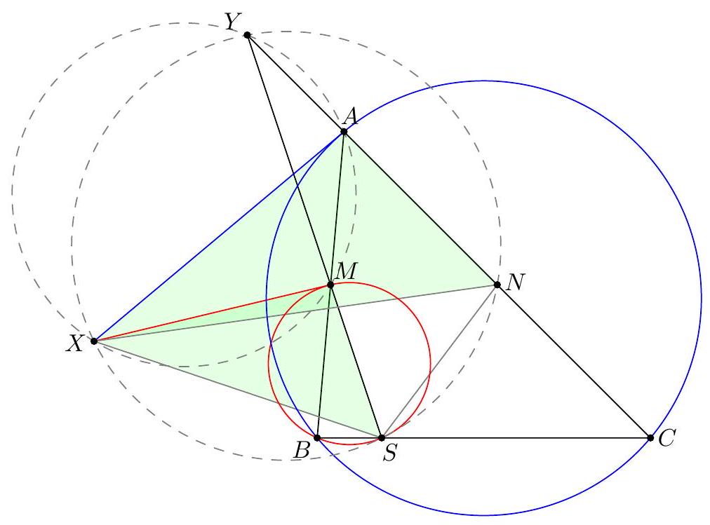 \I III-advised barycentric approach (outline). Use reference triangle $A B C$. The $A$ median is parametrized by $(t: 1: 1)$ for $t \in \mathbb{R}$. So because of $\overline{C P} \perp \overline{A M}$, we are looking for $t$ such that $$ \left(\frac{t \vec{A}+\vec{B}+\vec{C}}{t+2}-\vec{C}\right) \perp\left(A-\frac{\vec{B}+\vec{C}}{2}\right) $$ This is equivalent to $$ (t \vec{A}+\vec{B}-(t+1) \vec{C}) \perp(2 \vec{A}-\vec{B}-\vec{C}) $$ By the perpendicularity formula for barycentric coordinates (EGMO 7.16), this is equivalent to $$ \begin{aligned} 0 & =a^{2} t-b^{2} \cdot(3 t+2)+c^{2} \cdot(2-t) \\ & =\left(a^{2}-3 b^{2}-c^{2}\right) t-2\left(b^{2}-c^{2}\right) \\ \Longrightarrow t & =\frac{2\left(b^{2}-c^{2}\right)}{a^{2}-3 b^{2}-c^{2}} \end{aligned} $$ In other words, $$ P=\left(2\left(b^{2}-c^{2}\right): a^{2}-3 b^{2}-c^{2}: a^{2}-3 b^{2}-c^{2}\right) . $$ A long calculation gives $a^{2} y_{P} z_{P}+b^{2} z_{P} x_{P}+c^{2} x_{P} y_{P}=\left(a^{2}-3 b^{2}-c^{2}\right)\left(a^{2}-b^{2}+c^{2}\right)\left(a^{2}-\right.$ $\left.2 b^{2}-2 c^{2}\right)$. Together with $x_{P}+y_{P}+z_{P}=2 a^{2}-4 b^{2}-4 c^{2}$, this makes the equation of $(A B P)$ as $$ 0=-a^{2} y z-b^{2} z x-c^{2} x y+\frac{a^{2}-b^{2}+c^{2}}{2} z(x+y+z) $$ To solve for $Q$, set $x=0$ to get to get $$ a^{2} y z=\frac{a^{2}-b^{2}+c^{2}}{2} z(y+z) \Longrightarrow \frac{y}{z}=\frac{a^{2}-b^{2}+c^{2}}{a^{2}+b^{2}-c^{2}} $$ In other words, $$ Q=\left(0: a^{2}-b^{2}+c^{2}: a^{2}+b^{2}-c^{2}\right) $$ Taking the average with $A=(1,0,0)$ then gives $$ N=\left(2 a^{2}: a^{2}-b^{2}+c^{2}: a^{2}+b^{2}-c^{2}\right) . $$ The equation for the perpendicular bisector of $\overline{B C}$ is given by (see EGMO 7.19) $$ 0=a^{2}(z-y)+x\left(c^{2}-b^{2}\right) $$ which contains $N$, as needed. $$ p=\frac{(a-m) \bar{c}+(\bar{a}-\bar{m}) c+\bar{a} m-a \bar{m}}{2(\bar{a}-\bar{m})}=\frac{a^{2} b-a^{2} c-a b^{2}-2 a b c-a c^{2}+b^{2} c+3 b c^{2}}{4 b c-2 a(b+c)} $$ Meanwhile, an extremely ugly calculation will eventually yield $$ q=\frac{\frac{b c}{a}+b+c-a}{2} $$ SO $$ n=\frac{a+q}{2}=\frac{a+b+c+\frac{b c}{a}}{4}=\frac{(a+b)(a+c)}{2 a} $$ There are a few ways to then verify $N B=N C$. The simplest seems to be to verify that $$ \frac{n-\frac{b+c}{2}}{b-c}=\frac{a-b-c+\frac{b c}{a}}{4(b-c)}=\frac{(a-b)(a-c)}{2 a(b-c)} $$ is pure imaginary, which is clear.