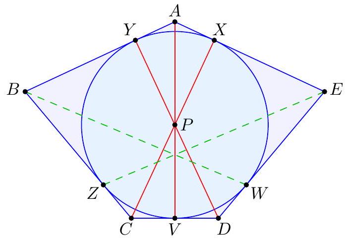 This problem is insta-killed by taking a homography sending the concurrency point (in either part) to the center of the circle while fixing the incircle. Alternatively, one may send any four of the tangency points to a rectangle. Here are the details. Let $A B C D E$ be a pentagon with gergonnians $\overline{A V}, \overline{B W}, \overline{C X}$, $\overline{D Y}, \overline{E Z}$. We prove the following lemma, which (up to a suitable permutation of point names) solves both parts (a) and (b). ## Lemma The gergonnians $\overline{A V}, \overline{C X}, \overline{D Y}$ are concurrent if and only if the gergonnians $\overline{A V}$, $\overline{B W}, \overline{E Z}$ are concurrent.  Then $X$ and $Y$ are symmetric around $\overline{A P V}$ by hypothesis. Since $D=\overline{V V} \cap \overline{P Y}$, $C=\overline{V V} \cap \overline{P X}$, it follows that $C$ and $D$, and hence $Z$ and $W$, are also symmetric around $\overline{A P V}$. Consequently $B$ and $E$ are symmetric too. So $\overline{B W}$ and $\overline{E Z}$ meet on $\overline{A V}$.