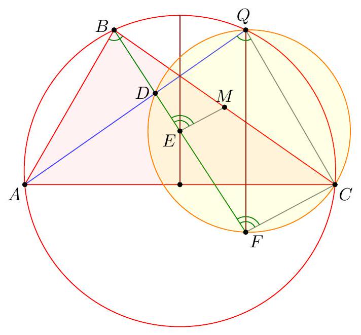 Claim - We have DQCF is cyclic. $$ \begin{aligned} \measuredangle F D C & =-\measuredangle C D B=180^{\circ}-\left(90^{\circ}+\measuredangle C A B\right)=90^{\circ}-\measuredangle C A B \\ & =90^{\circ}-\measuredangle Q C A=\measuredangle F Q C . \end{aligned} $$ To conclude, note that $$ \measuredangle B E M=\measuredangle B F C=\measuredangle D F C=\measuredangle D Q C=\measuredangle A Q C=\measuredangle A B C=\measuredangle A B M . $$ Remark (Motivation). Here is one possible way to come up with the construction of point $F$ (at least this is what led Evan to find it). If one directs all the angles in the obvious way, there are really two points $D$ and $D^{\prime}$ that are possible, although one is outside the triangle; they give corresponding points $E$ and $E^{\prime}$. The circles $B E M$ and $B E^{\prime} M$ must then actually coincide since they are both alleged to be tangent to line $A B$. See the figure below.  One can already prove using angle chasing that $\overline{A B}$ is tangent to $\left(B E E^{\prime}\right)$. So the point of the problem is to show that $M$ lies on this circle too. However, from looking at the diagram, one may realize that in fact it seems $$ \triangle M E E^{\prime} \stackrel{\triangle}{\sim} \triangle C D D^{\prime} $$ is going to be true from just those marked in the figure (and this would certainly imply the desired concyclic conclusion). Since $M$ is a midpoint, it makes sense to dilate $\triangle E M E^{\prime}$ from $B$ by a factor of 2 to get $\triangle F C F^{\prime}$ so that the desired similarity is actually a spiral similarity at $C$. Then the spiral similarity lemma says that the desired similarity is equivalent to requiring $\overline{D D^{\prime}} \cap \overline{F F^{\prime}}=Q$ to lie on both $(C D F)$ and $\left(C D^{\prime} F^{\prime}\right)$. Hence the key construction and claim from the solution are both discovered naturally, and we find the solution above. (The points $D^{\prime}, E^{\prime}, F^{\prime}$ can then be deleted to hide the motivation.) Another short solution. Let $Z$ be on line $B D E$ such that $\angle B A Z=90^{\circ}$. This lets us interpret the angle condition as follows: Claim - Points $A, D, Z, C$ are cyclic.  Define $W$ as the midpoint of $\overline{B Z}$, so $\overline{M W} \| \overline{C Z}$. And let $O$ denote the center of $(A B C)$. Claim - Points $M, E, O, W$ are cyclic. $$ \begin{aligned} \measuredangle M O E & =\measuredangle(\overline{O M}, \overline{B C})+\measuredangle(\overline{B C}, \overline{A C})+\measuredangle(\overline{A C}, \overline{O E}) \\ & =90^{\circ}+\measuredangle B C A+90^{\circ} \\ & =\measuredangle B C A=\measuredangle C A D=\measuredangle C Z D=\measuredangle M W D=\measuredangle M W E . \end{aligned} $$ To finish, note $$ \begin{aligned} \measuredangle M E B & =\measuredangle M E W=\measuredangle M O W \\ & =\measuredangle(\overline{M O}, \overline{B C})+\measuredangle(\overline{B C}, \overline{A B})+\measuredangle(\overline{A B}, \overline{O W}) \\ & =90^{\circ}+\measuredangle C B A+90^{\circ}=\measuredangle C B A=\measuredangle M B A . \end{aligned} $$ This implies the desired tangency.