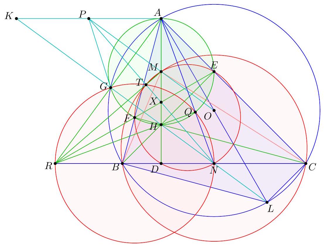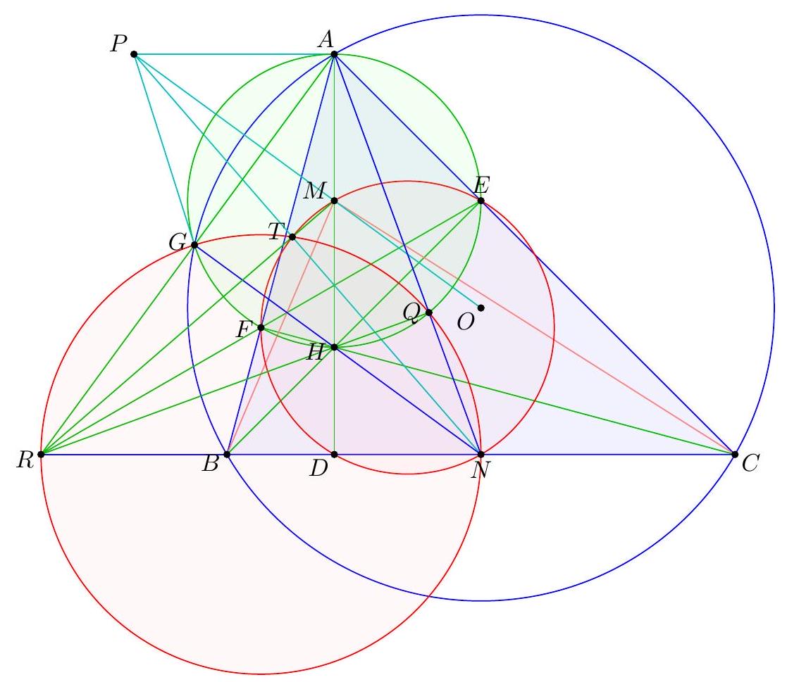 γ First solution (found by contestants). Denote by $\triangle D E F$ the orthic triangle. Observe $\overline{P A}$ and $\overline{P G}$ are tangents to $\gamma$, since $\overline{O M}$ is the perpendicular bisector of $\overline{A G}$. Also note that $\overline{A G}, \overline{E F}, \overline{B C}$ are concurrent at some point $R$ by radical axis on $(A B C), \gamma$, (BFEC). Now, consider circles (PAGM), (MFDNE), and (MBC). We already saw the point $R$ satisfies $$ R A \cdot R G=R E \cdot R F=R B \cdot R C $$ and hence has equal powers to all three circles; but since the circles at $M$ already, they must actually be coaxial. Assume they meet again at $T \in \overline{R M}$, say. Then $\angle P T M$ and $\angle M T N$ are both right angles, hence $T$ lies on $\overline{P N}$. Finally $H$ is the orthocenter of $\triangle A R N$, and thus the circle with diameter $\overline{R N}$ passes through $G, Q, N$.