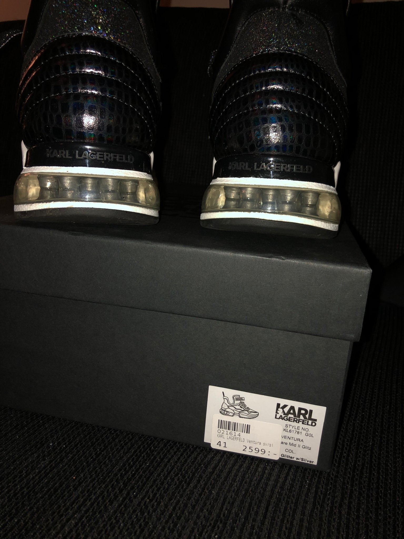 Black and silver sneakers, placed on a black carpet with their box nearby, feature prominently in the image.