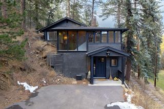 A sleek, contemporary black house perched on a snow-covered hill boasts a metal roof and a striking chimney, while a person stands outside, possibly taking in the picturesque view or awaiting someone.