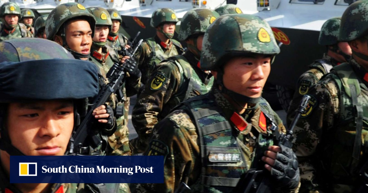A formation of soldiers, dressed in uniforms and armed with automatic rifles, stands at attention, likely representing the Chinese military.