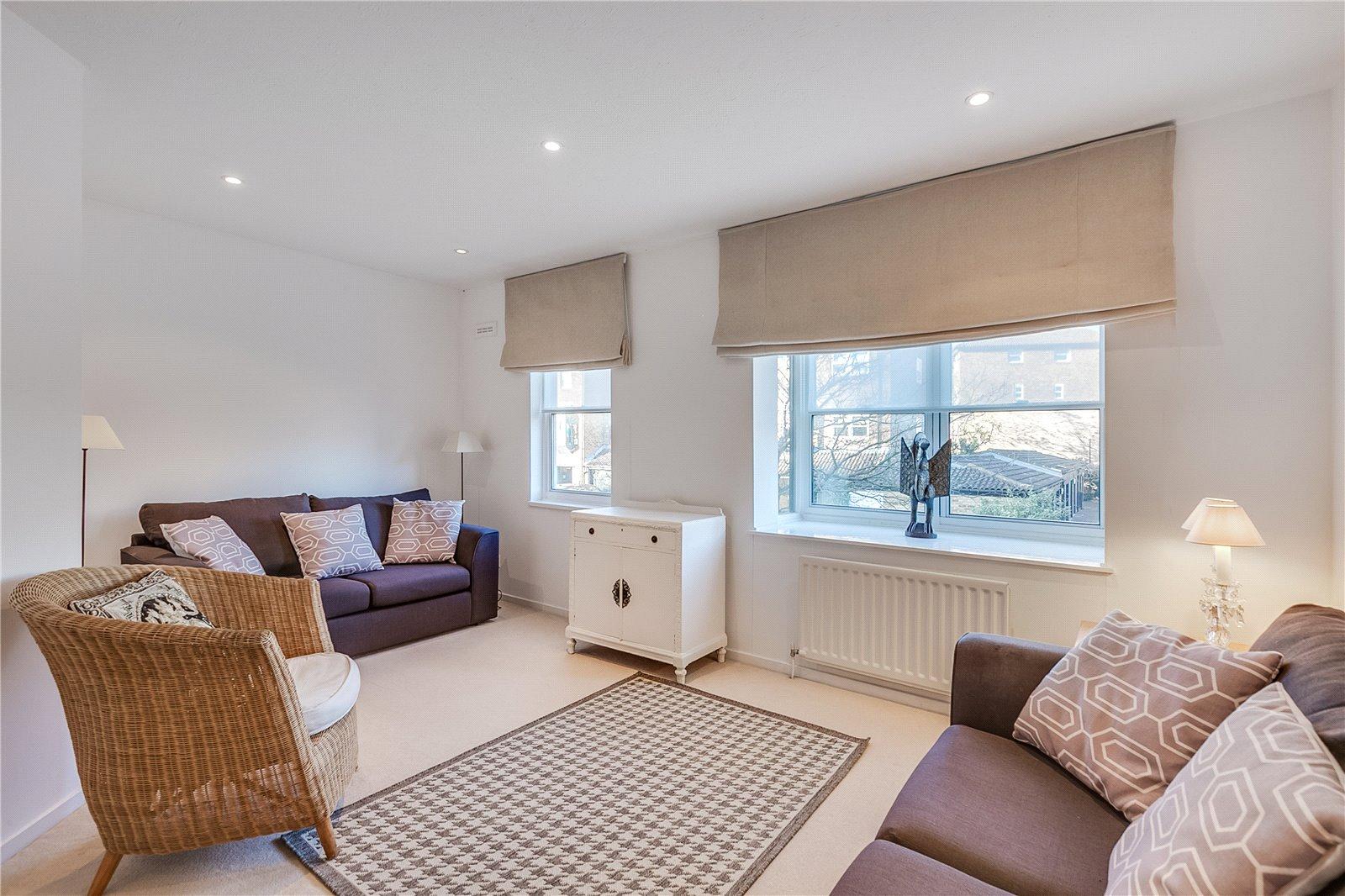 A spacious living room with large windows, white walls, and a modern, minimalist design features a comfortable seating area with a brown couch and love seat, both positioned in front of the windows.