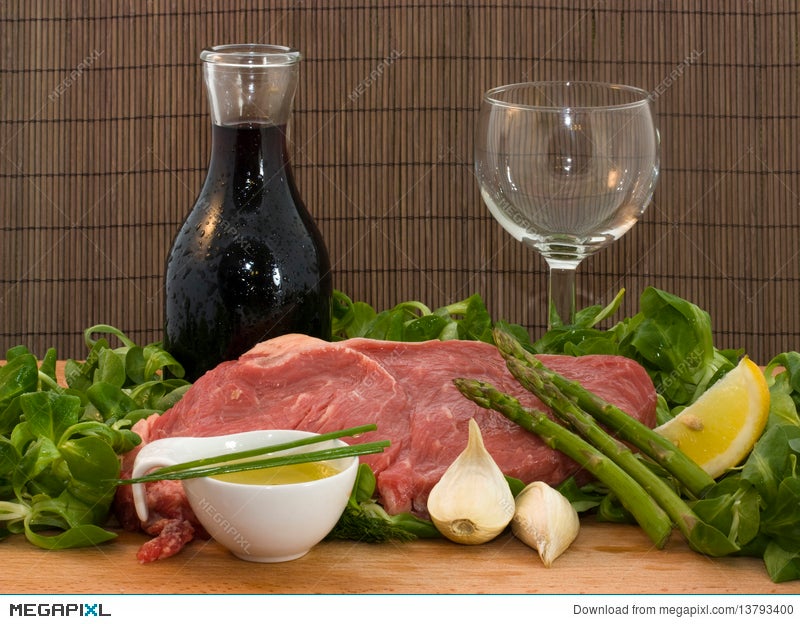A juicy beef steak sits atop a wooden cutting board, surrounded by fresh asparagus, onions, and a glass of wine, evoking a meal preparation scene.