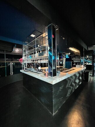 Miami, FL Retail for Sale - 3138 SW 22nd St, featuring a bar with a black counter and a large, illuminated liquor bottle behind it, attractively displays several wine glasses on the counter.