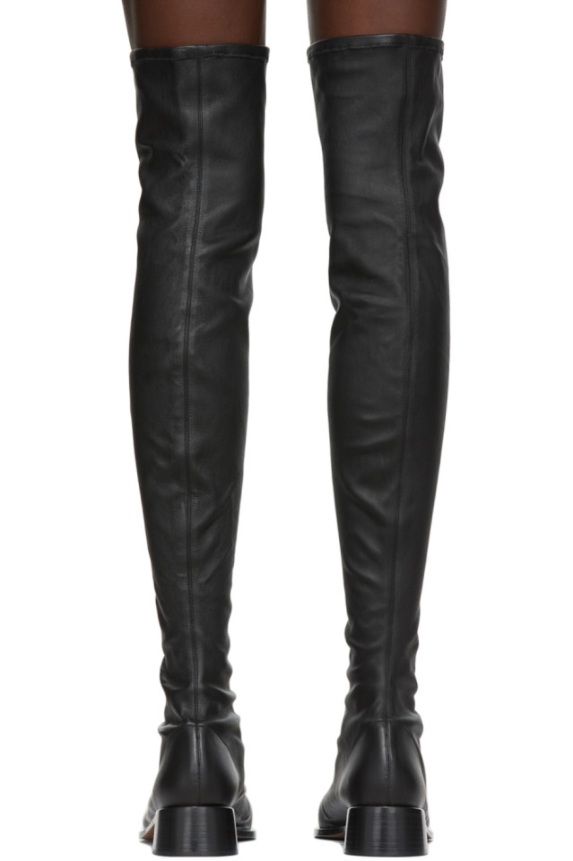 The midsection-high black leather boots draw attention, set against a primarily white backdrop, creating an impression of standing in water.