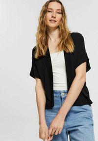 The woman stands confidently in a room, her hands tucked into her blue jeans pockets, wearing a stylish outfit of a black shirt and cardigan that exudes comfort and sophistication.