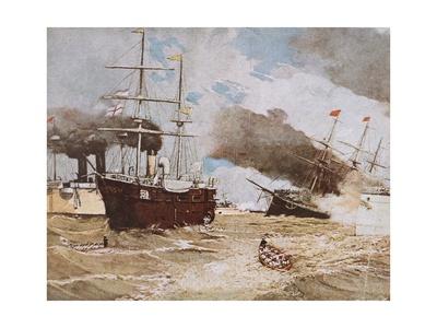 Two historic sailing vessels, one positioned on the left and the other on the right, are anchored in a tranquil harbor near the shoreline, engaged in a cannon-firing battle.
