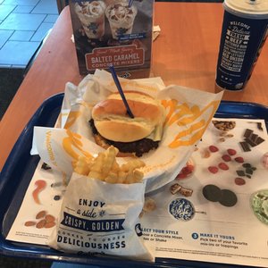 A delectable meal, served on a blue tray, showcases a mouthwatering burger as the main course, accompanied by a few crispy fries and a refreshing drink nestled beside the tray. The fast food restaurant's logo is subtly visible on the packaging, adding a touch of authenticity to the dish.