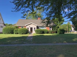 A one-story red brick house with a spacious front yard is surrounded by a lush lawn and shaded by several trees, creating a tranquil atmosphere. A car is parked on the driveway.