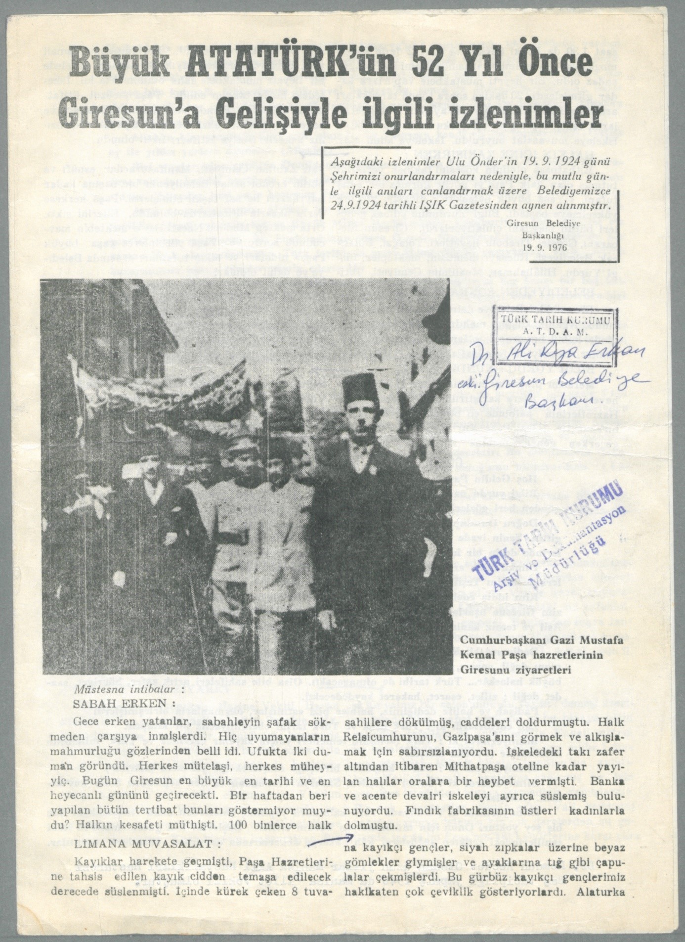 1924 yılı Eylül ayında Boğazlardan geçerek Karadeniz’e yaptığı sonbahar gezisi çerçevesinde Mustafa Kemal Paşa’nın Giresun Ziyareti