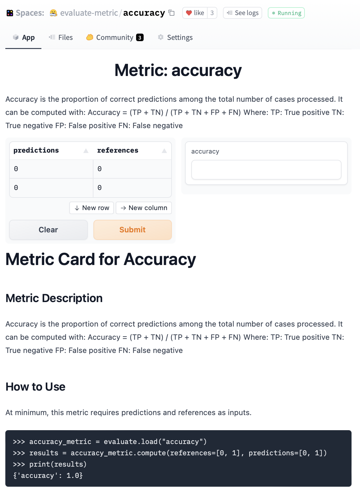 Each of these evaluation modules live on Hugging Face Hub as a Space. They come with an interactive widget and a documentation card documenting its use and limitations. For example accuracy: